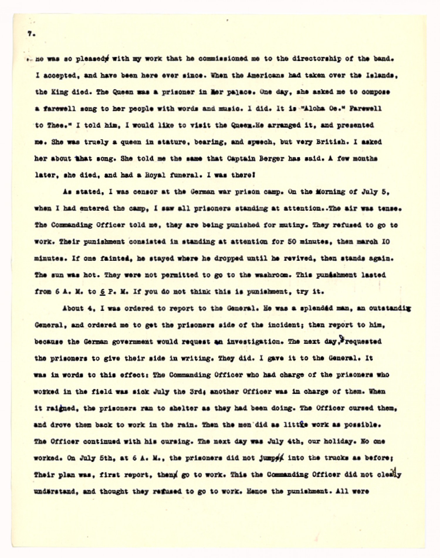 [page 7] He was so pleased with my work that he commissioned me to the directorship of the band. I accepted, and have been here ever since. When the Americans had taken over the Islands, the King died. The Queen was a prisoner in her palace. One day, she asked me to compose a farewell song to her people with words and music. I did. It is