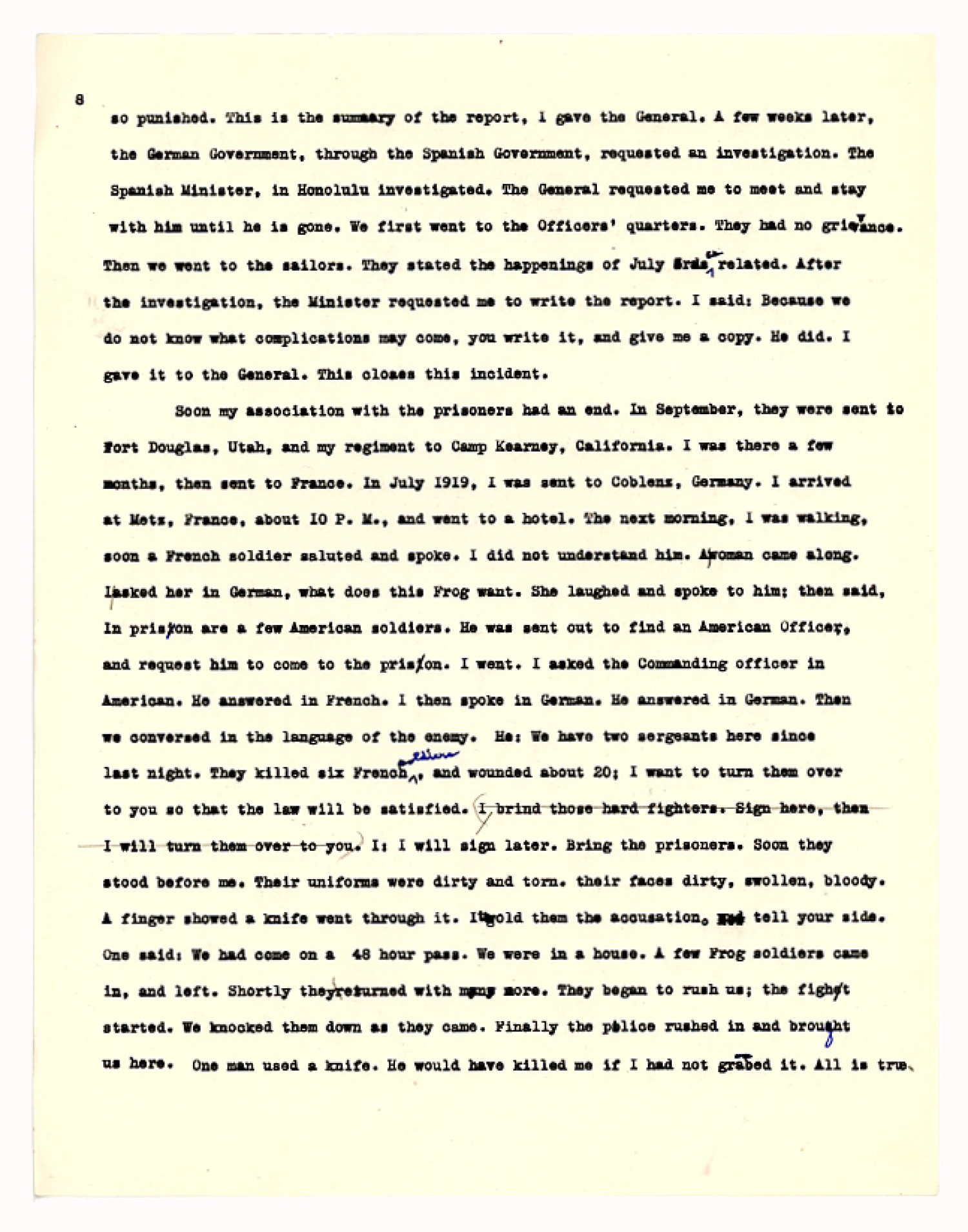 [page 8] so punished. This is the summary of the report, I have the General. A few weeks later, the German Government, through the Spanish Government, requested an investigation. The Spanish Minister, in Honolulu investigated. The General requested me to meet and stay with him until he is gone. We first went to the Officers