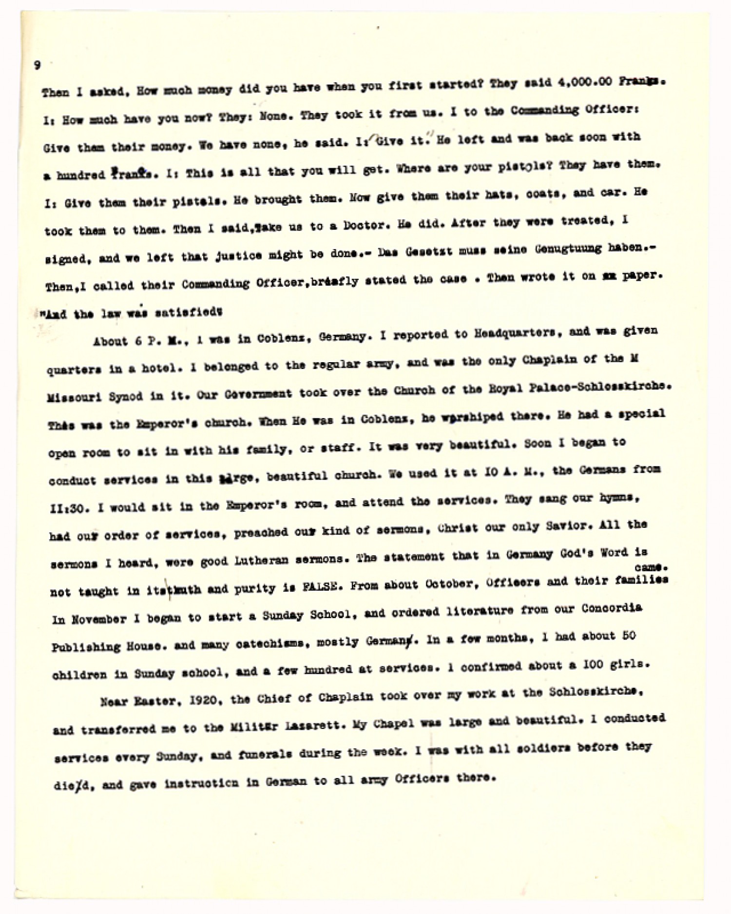 [page 9] Then I asked, How much money did you have when you first started? They said 4,000.00 Franks. I: How much have you now? They: None. They took it from us. I to the Commanding Officer: Give them their money. We have none, he said. I: Give it. He left and was back soon with a hundred francs. I: This is all that you will get. Where are your pistols? They have them. I: Give them their pistols. He brought them. Now give them their hats, coats, and car. He took them to them. Then I said, Take us to a Doctor. He did. After they were treated, I signed, and we left that justice might be done.- Das Gesetz muss seine Genugtuung haben.- Then, I called their Commanding Officer, briefly stated the case . Then write it on paper.