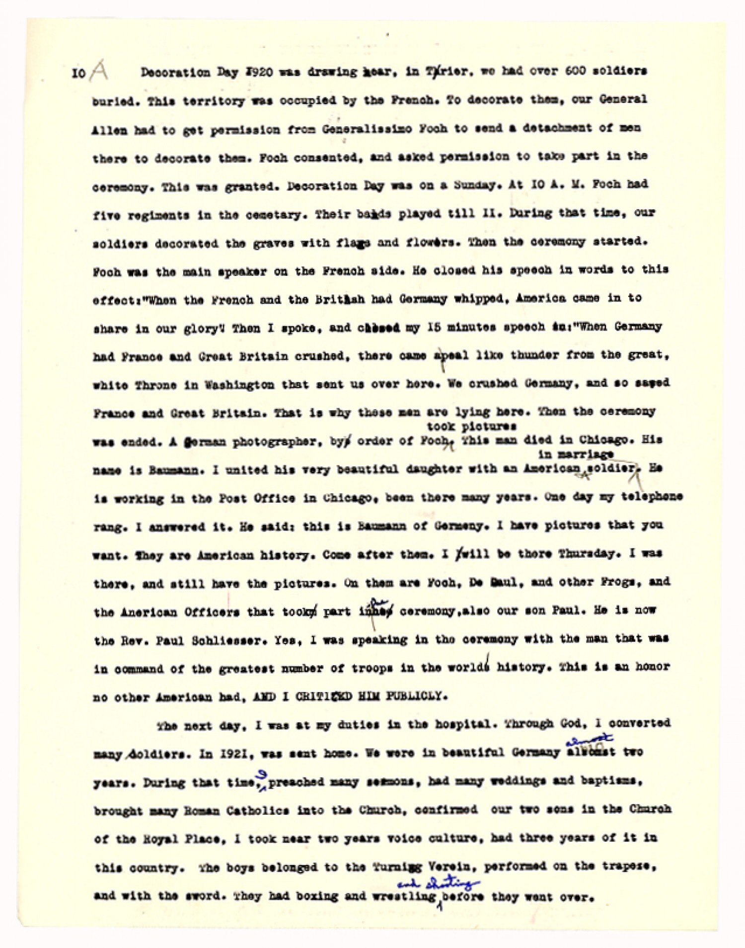 [page 10] 10A Decoration Day 1920 was drawing near, in Trier, we had over 600 soldiers buried. This territory was occupied by the French. To decorate them, our General Allen had to get permission from Generalissimo Foch to send a detachment of men there to decorate them. Foch consented, and asked permission to take part in the ceremony. This was granted. Decoration Day was on a Sunday. At 10 A. M. Foch had five regiments in the cemetery. Their bands played till 11. During that time, our soldiers decorated the graves with flags and flowers. Then the ceremony started. Foch was the main speaker on the French side. He closed his speech in words to this effect: