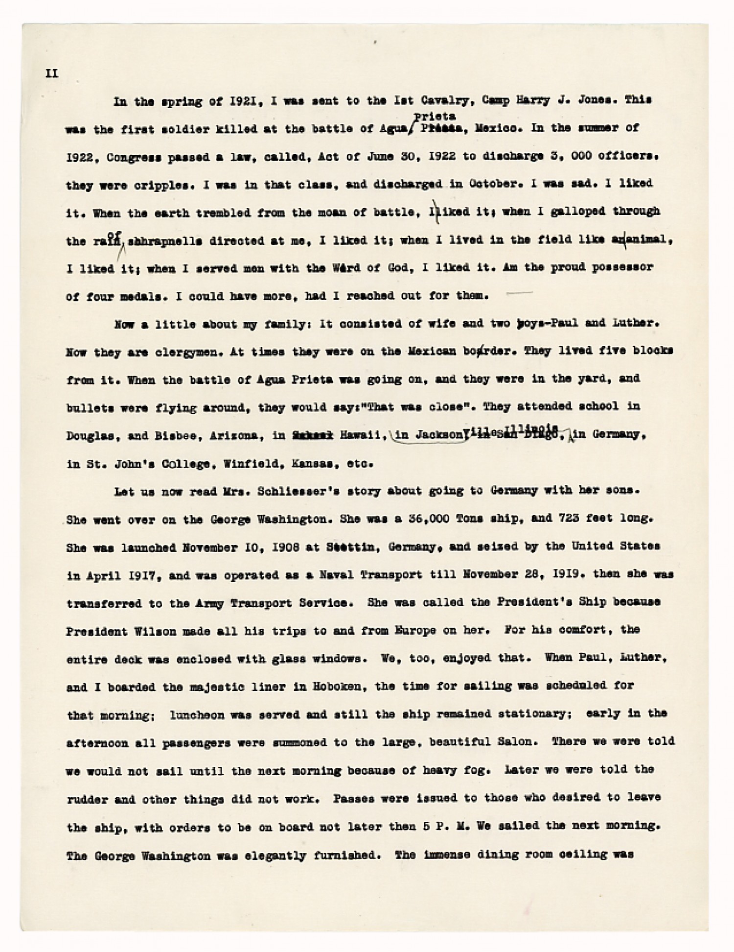 [page 11] In the spring of 1921, I was sent to the 1st Cavalry, Camp Harry J. Jones. This was the first soldier killed at the battle of Agua Prieta, Mexico. In the summer of 1922, Congress passed a law, called, Act of June 30, 1922 to discharge 3,000 officers, they were cripples. I was in that class, and discharged in October. I was sad. I liked it. When the earth trembled from the moan of battle, I like it, when I galloped through the rain of schrapnells directed at me, I liked it; when I lived in the field like an animal, I like it; when I served men with the Word of God, I like it. Am the proud possessor of four medals. I could have more, had I reached out for them. Now a little about my family: It consisted of wife and two boys-Paul and Luther. Now they are clergymen. At times they were on the Mexican border. They lived five blocks from it. When the battle of Agua Prieta was going on, and they were in the yard, and bullets were flying around, they would say: