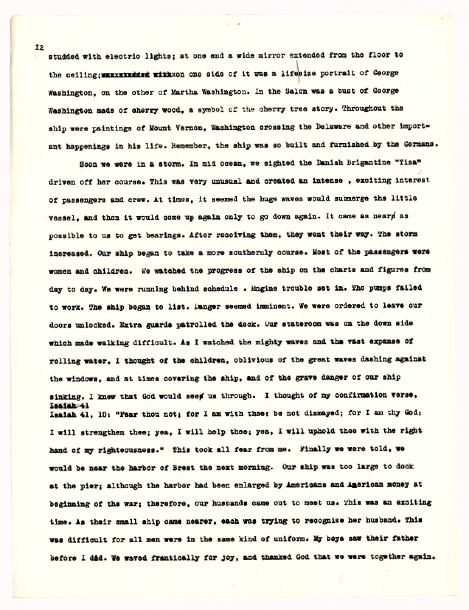 [page 12] studded with electric lights; at one end a wide mirror extended from the floor to the ceiling on one side of it was a life size portrait of George Washington, on the other of Martha Washington. In the Salon was a bust of George Washington made of cherry wood, a symbol of the cherry tree story. Throughout the ship were paintings of Mount Vernon, Washington crossing the Delaware and other important happenings in his life. Remember, the ship was so built and furnished by the Germans. Soon we were in a storm. In mid ocean, we sighted the Danish Brigantine