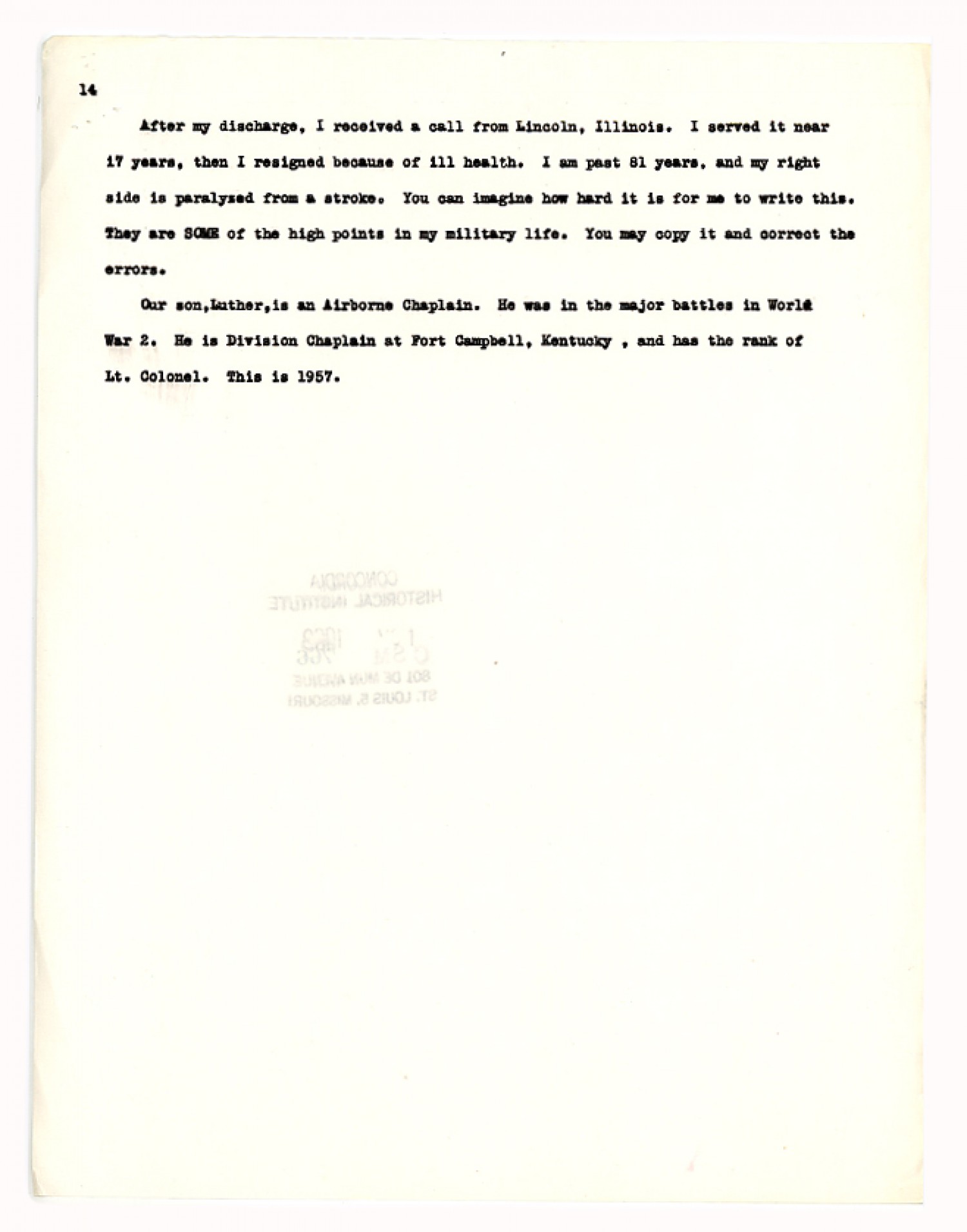 [page 14] After my discharge, I received a call from Lincoln, Illinois. I served it near 17 years, then I resigned because of ill health. I am past 81 years, and my right side is paralyzed from a stroke. You can imagine how hard it is for me to write this. They are SOME of the high points in my military life. You may copy it and correct the errors. Our son, Luther, is an Airborne Chaplain. He was in the major battles in World War 2. He is Division Chaplain at Fort Campbell, Kentucky, and the rank of Lt. Colonel. This is 1957.