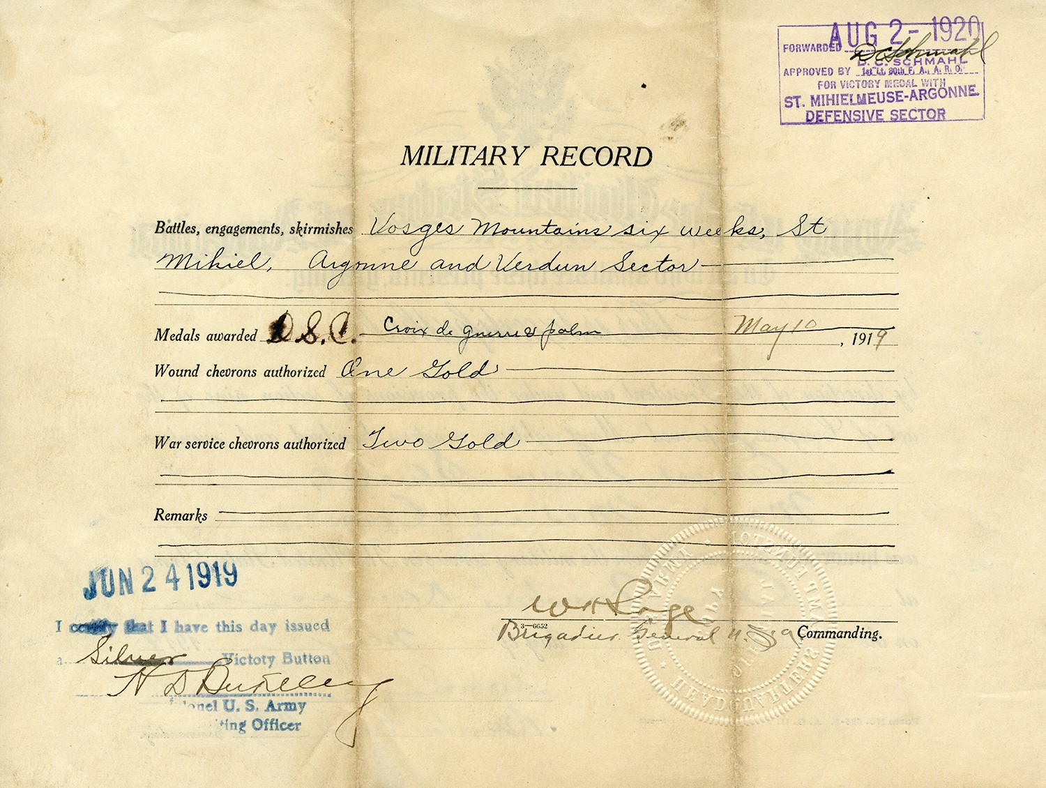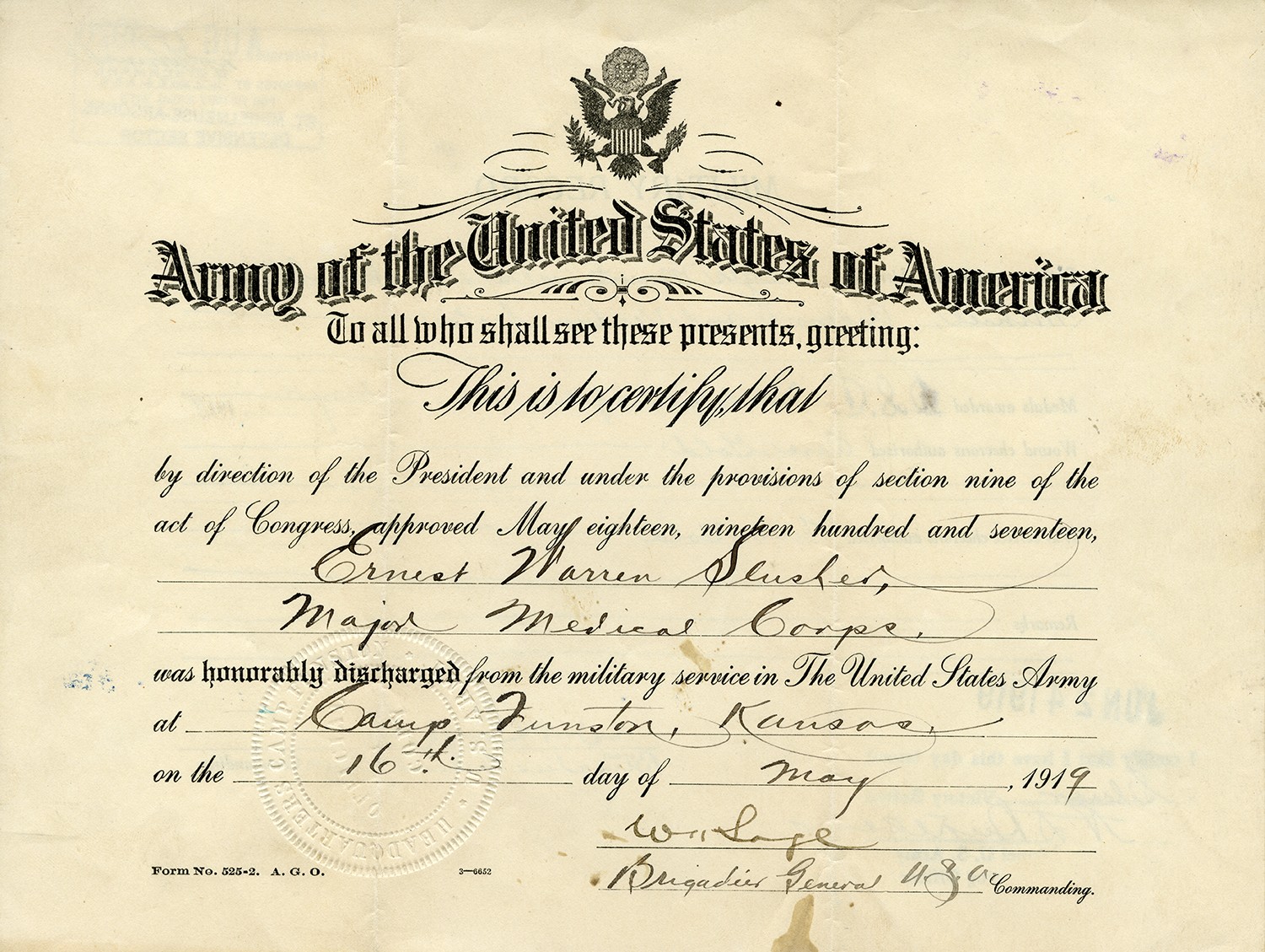 | Source | Unknown. Honorable Discharge for Ernest W. Slusher. May 16, 1919. Ernest W. Slusher Collection. The Missouri State Museum, Jefferson City Missouri |