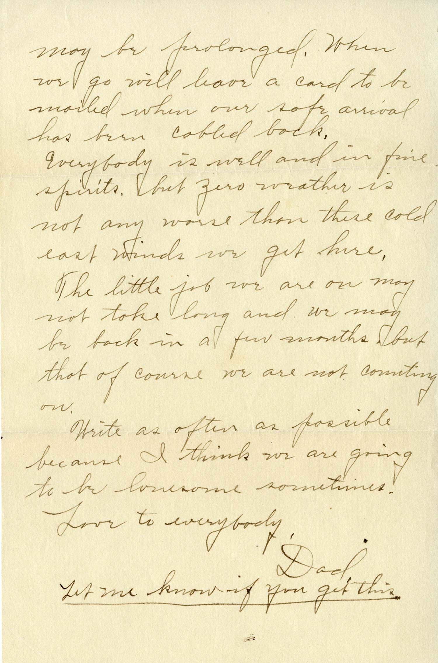 may be prolonged. When we go will leave a card to be mailed when our note arrival has been cabled back. Everybody is well and in fine spirits. I bet zero weather is not any worse than the cold east winds we get here. The little job we are on may not take long and we may be back in a few months, but that of course we are not counting on. Write as often as possible because I think we are going to be lonesome sometimes. Love to Everybody, Dad Let me know if you get this.