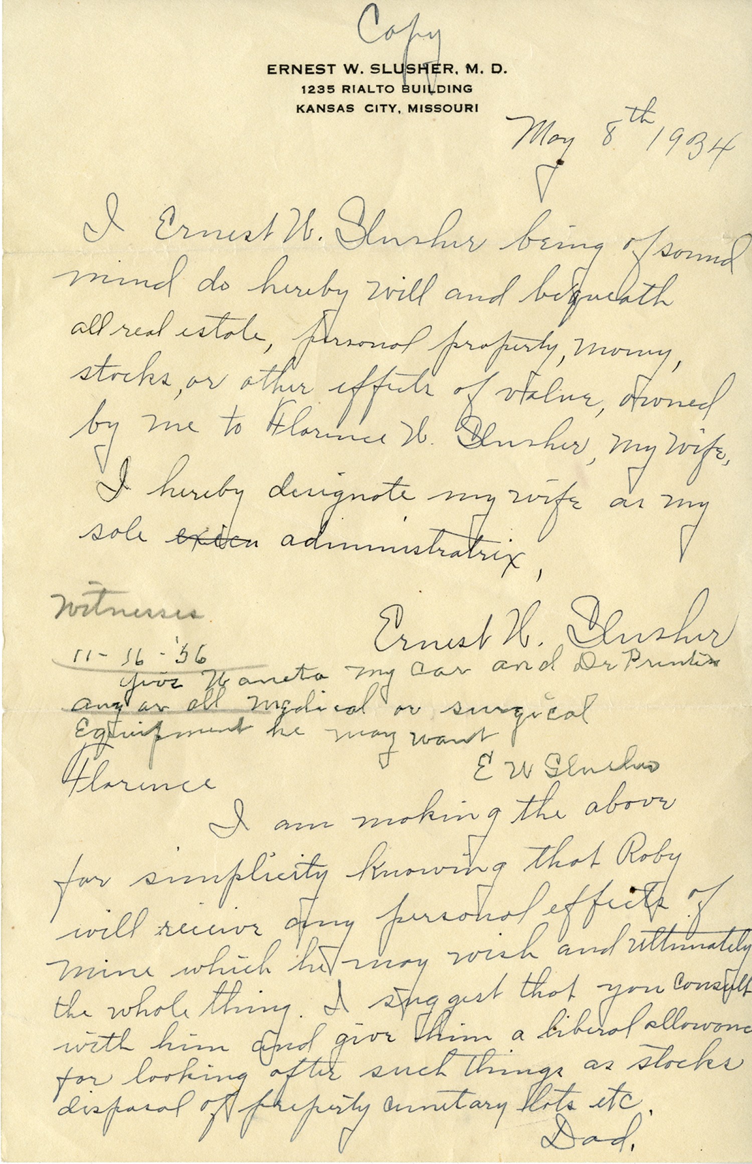 (Copy of will originally enclosed in 1918 letter, this copy was created on May 8, 1934 for an unknown reason) Copy Ernest W. Slusher, M.D. 1235 Rail to Building Kansas City, Missouri May 8th 1934 I Ernest M. Slusher being of sound mind do hereby will and bequeath all real estate, personal property, money, stocks, or other affects of value, owned by me to Florence H. Slusher, my wife. I hereby designate my wife on my sole administratrix, Ernest W. Slusher. Your [illegible] my car and Dr. [illegible] an and all medical or surgical equipment he may want. EW Slusher Florence I am working the above for simplicity knowing that Roby will receive any personal effects of mine he may wish and ultimately the whole thing. I suggest that you consult with him and give him a liberal allowance for looking after such things as stocks disposal of property [illegible] Dad
