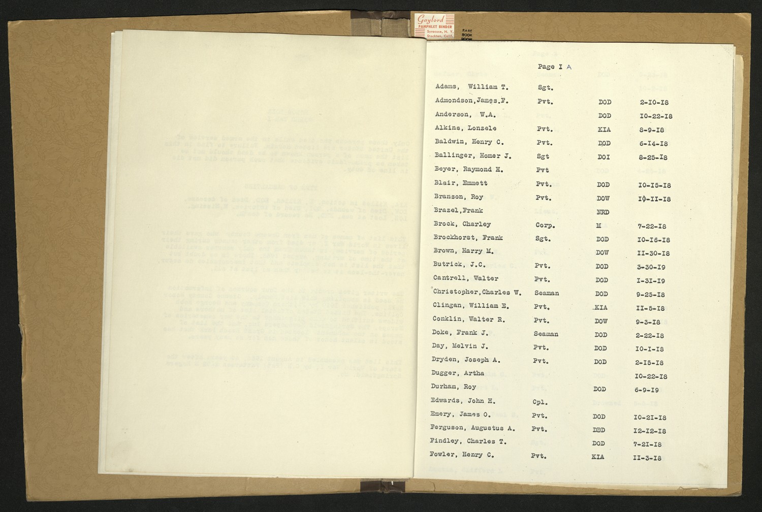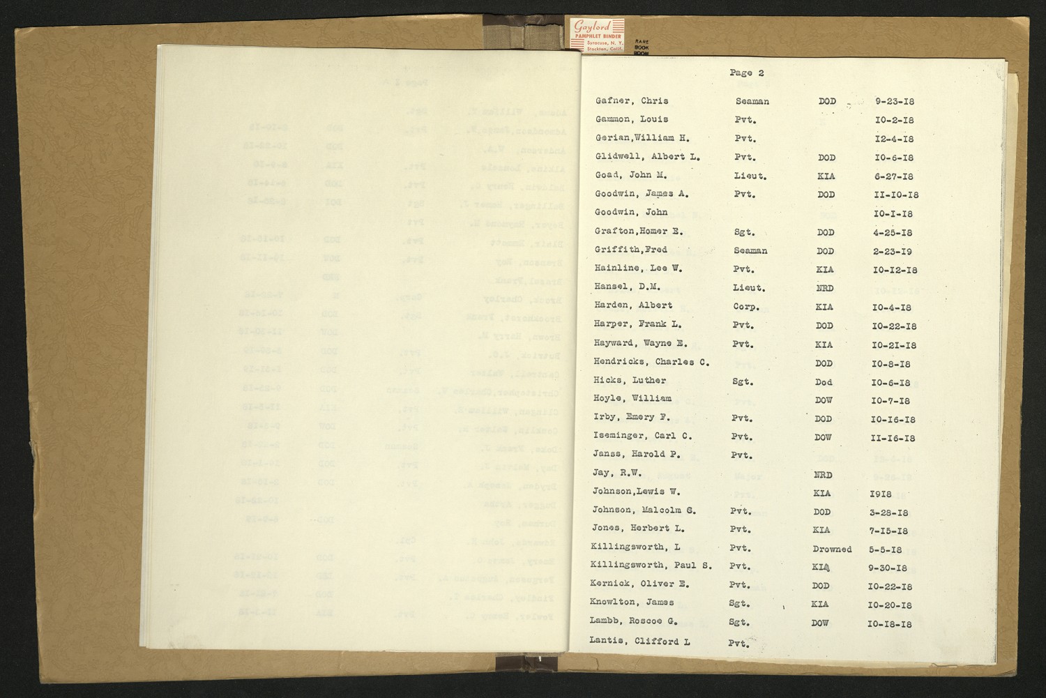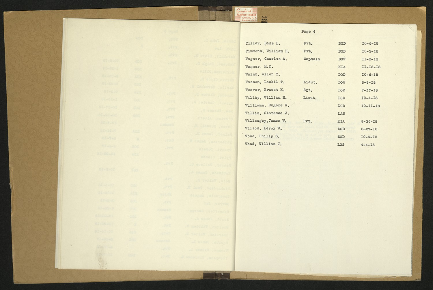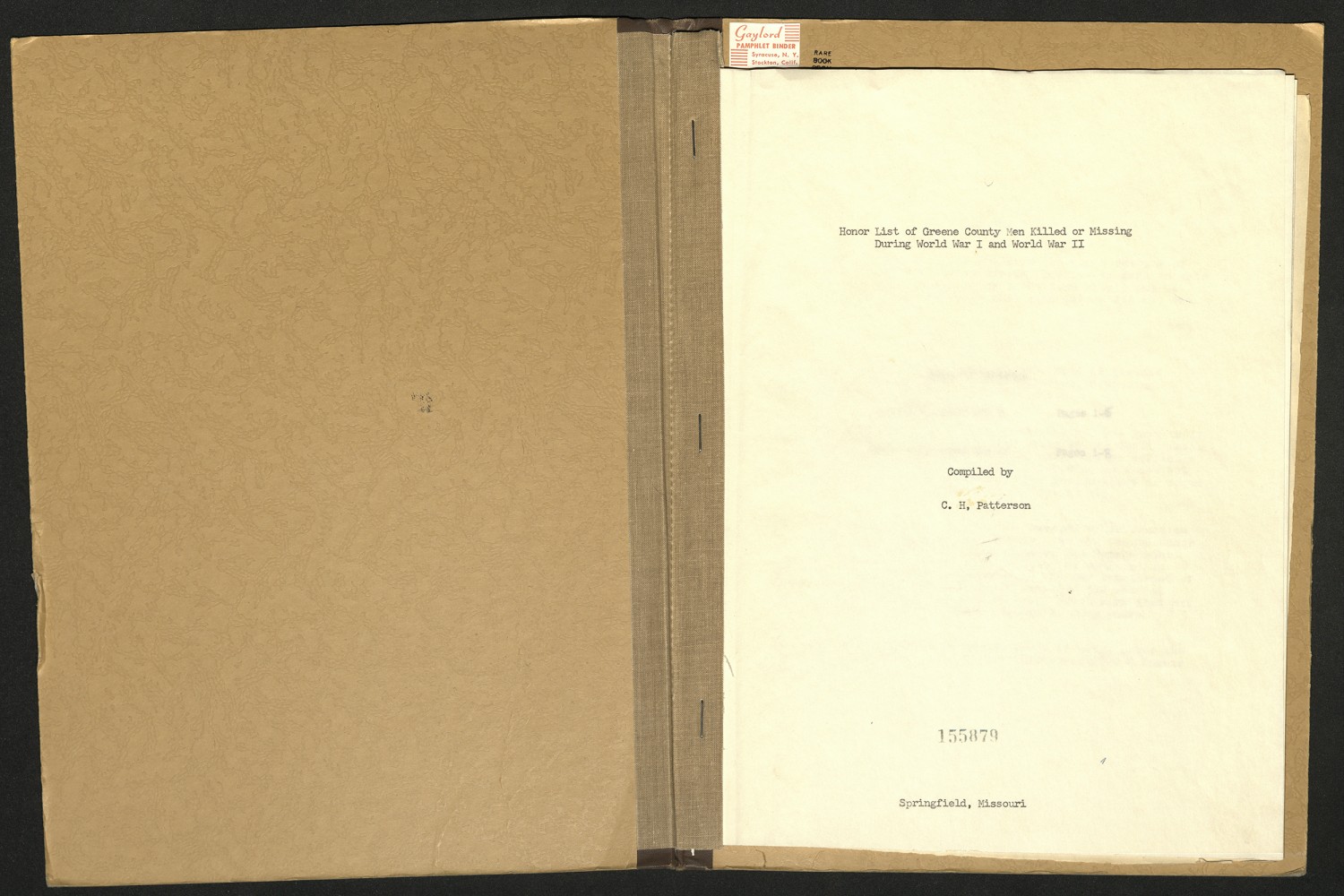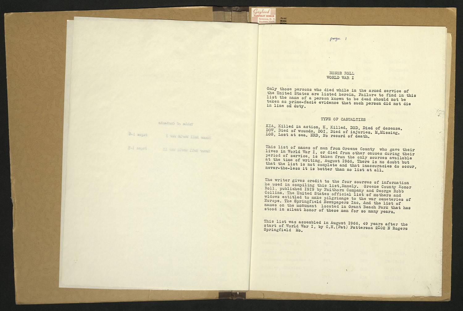 | Description | A list of Greene County men who died in WWI compiled by C.H. Patterson. The book also contains a list for WWII Greene County deceased, but was not included in this collection. For more information about WWII soldiers who died from Greene County please contact the Local History and Genealogy Department of the Springfield-Greene County Library District - (417)616-0534 |