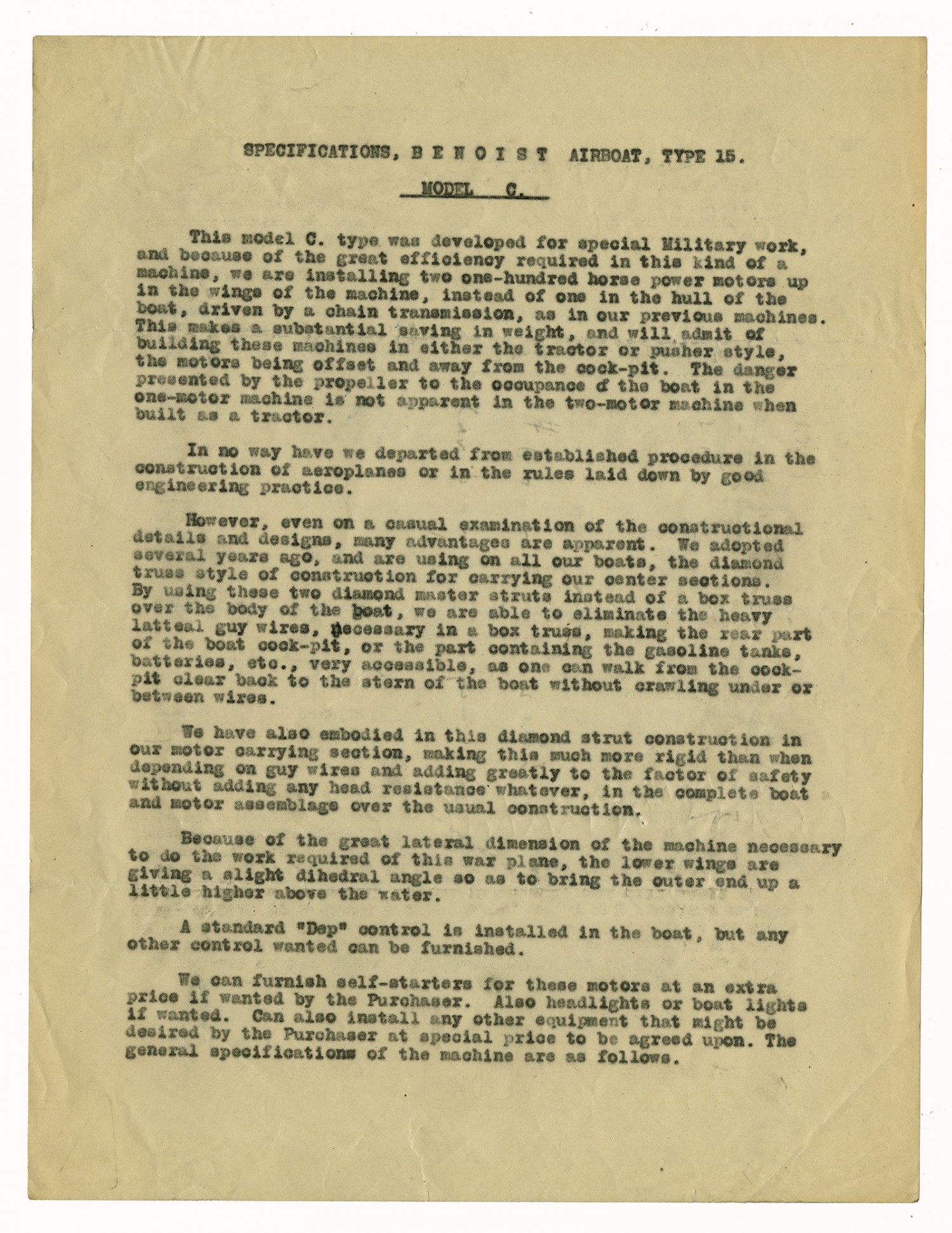 SPECIFICATIONS, BENOIST AIRBOAT, TYPE 15. MODEL C. This model C. type was developed for special Military work, and because of the great efficiency required in this kind of a machine, we are installing two one-hundred horse power motors up in the wings of the machine, instead of one in the hull of the boat, driven by a chain transmission, as in our previous machines. This makes a substantial saving in weight, and will admit of building these machines in either the tractor or pusher style, the motors being offset and away from the cock-pit. The danger presented by the propeller to the occupance of the boat in the one-motor machine is not apparent in the two-motor machine when built as a tractor. In no way have we departed from established procedure in the construction of aeroplanes or in the rules laid down by good engineering practice. However, even on a casual examination of the constructional details and designs, many advantages are apparent. We adopted several years ago, and are using on all our boats, the diamond truss style of construction for carrying our center sections. By using these two diamond master struts instead of a box truss over the body of the boat, we are able to eliminate the heavy latteal guy wires, necessary in a box truss, making the rear part of the boat cock-pit, or the part containing the gasoline tanks, batteries, etc., very accessible, as one can walk from the cock-pit clear back to the stern of the boat without crawling under or between wires. We have also embodied in this diamond strut construction in our motor carrying section, making this much more rigid than when depending on guy wires and adding greatly to the factor of safety without adding any head resistance whatever, in the complete boat and motor assemblage over the usual construction. Because of the great lateral dimension of the machine necessary to do the work required of this war plane, the lower wings are giving a slight dihedral angle so as to bring the outer end up a little height above the water. A standard