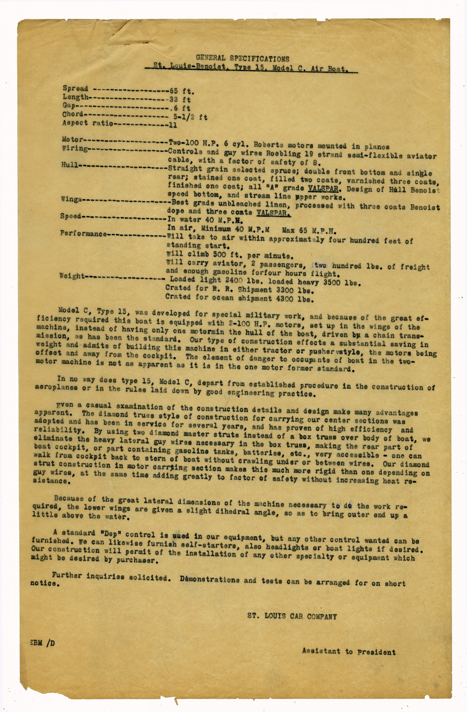 GENERAL SPECIFICATIONS St. Louis-Benoist, Type 15, Model C. Air Boat. Spread-65 ft. Length-32 ft. Gap-6 ft. Chord-5
