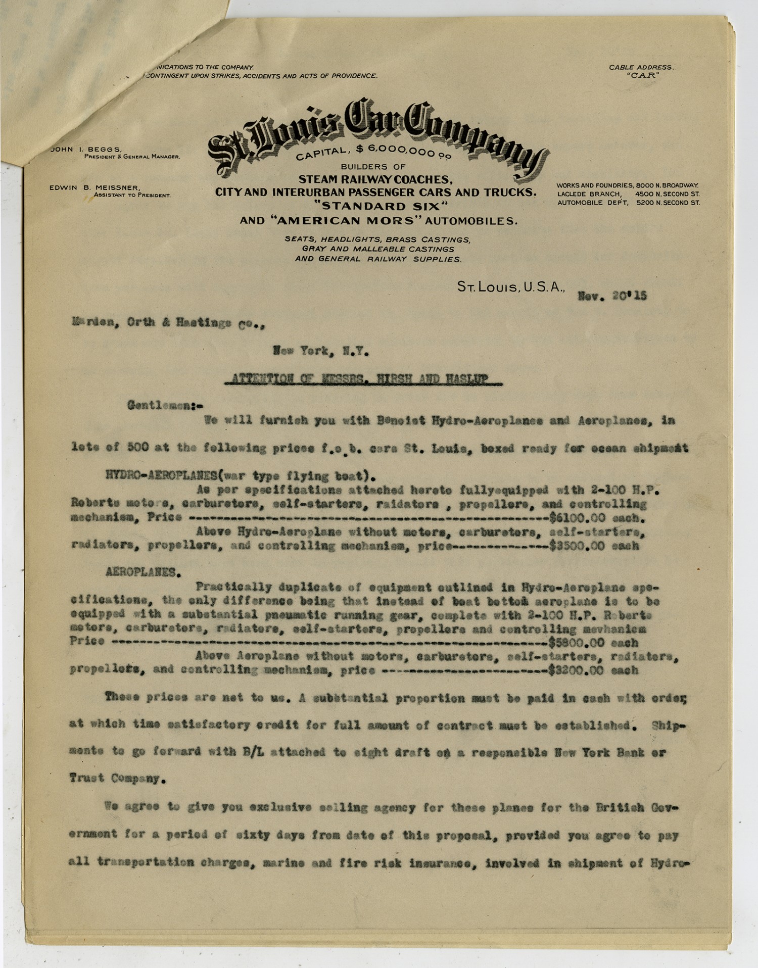 [St. Louis Car Company letterhead] St. Louis U.S.A. [November] 20, [1915] Marden, Orth & Hastings Co., New York, [New York] ATTENTION OF MESSRS. HIRSH AND HASLUP Gentlemen:- We will furnish you with Benoist Hydro-Aeroplanes and Aeroplanes, in lots of 500 at the following prices f.o.b. cars St. Louis, boxed ready for ocean shipment HYDRO-AEROPLANES(war type flying boat). As per specifications attached hereto fully equipped with 2-100 H.P. Roberts motors, carburetors, self-starters, raidators, propellers, and controlling mechanism, Price $6100.00 each. Above Hydro-Aeroplane without meters, carburetors, self-starters, radiators, propellers, and controlling mechanism, price $3500.00 each AEROPLANES. Practically duplicate of equipment outlined in Hydro-Aeroplane specifications, the only difference being that instead of boat bottom aeroplane is to be equipped with a substantial pneumatic running gear, complete with 2-100 H.P. Roberts motors, carburetors, radiators, self-starters, propellers and controlling mechanism Price $5800.00 each Above Aeroplane without motors, carburetors, self-starters, radiators, propellers, and controlling mechanism, price $3200.00 each These prices are not to us. A substantial proportion must be paid in cash with order, at which time satisfactory credit for full amount of contract must be established. Shipments to go forward with B/L attached to sight draft on a responsible New York Bank or Trust Company. We agree to give you exclusive selling agency for these planes for the British Government for a period of sixty days from date of this proposal, provided you agree to pay all transportation charges, marine and fire risk insurance, involved in shipment of Hydro-