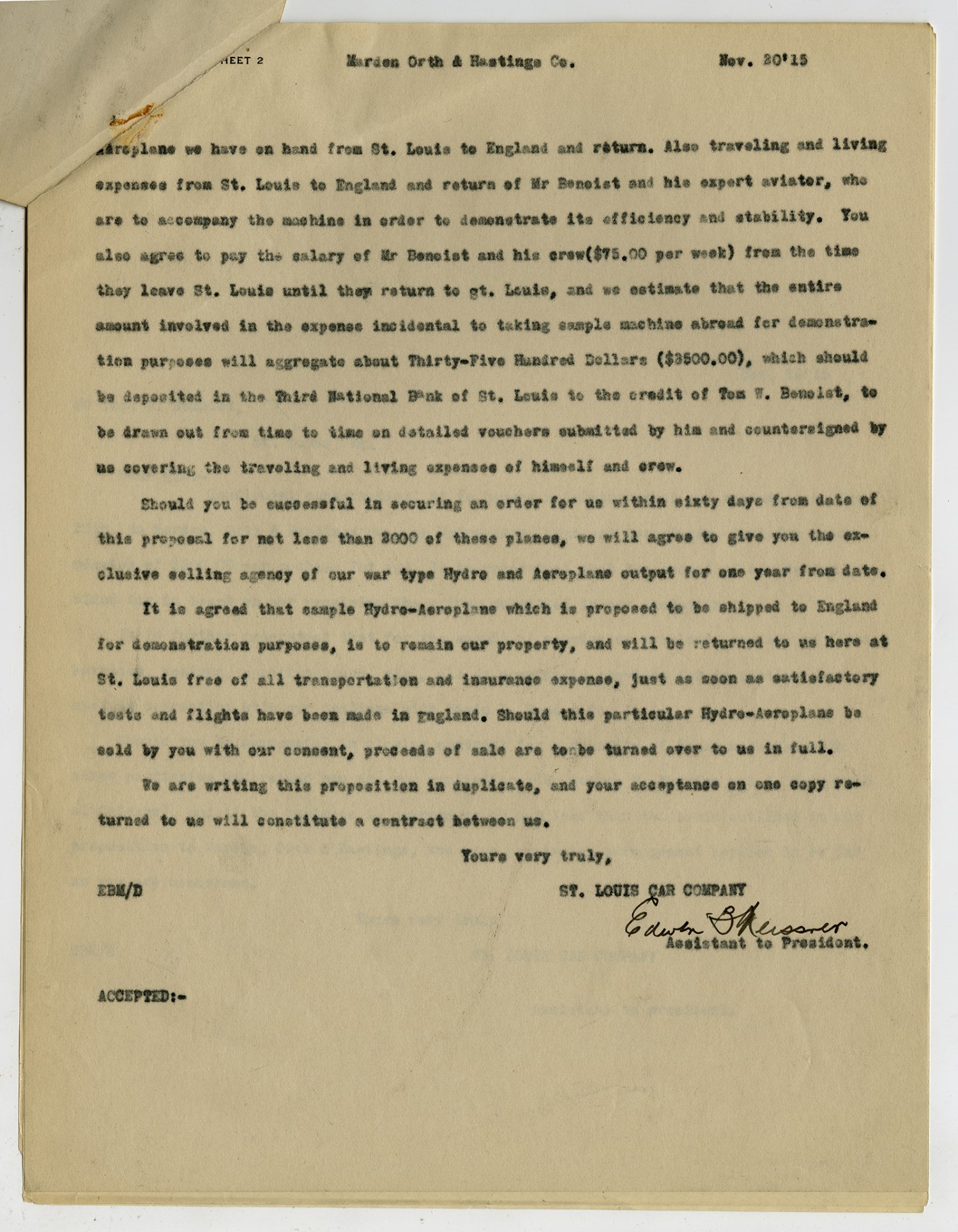Marden Orth & Hastings Co. [November] 20 [1915] Aeroplane we have on hand from St. Louis to England and return. Also traveling and living expenses from St. Louis to England and return of Mr Benoist and his expert aviator, who are to accompany the machine in order to demonstrate its efficiency and stability. You also agree to pay the salary of Mr Benoist and his crew ($75.00 per week) from the time they leave St. Louis until they return to St. Louis, and we estimate that the entire amount involved in the expense incidental to taking sample machine abroad for demonstration purposes will aggregate about Thirty-Five Hundred Dollars ($3500.00), which should be deposited in the Third National Bank of St. Louis to the credit of Tom W. Benoist, to be drawn out from time to time on detailed vouchers submitted by him and countersigned by us covering the traveling and living expenses of himself and crew. Should you be successful in securing an order for us within sixty days from date of this proposal for not less that 2000 of these planes, we will agree to give you the exclusive selling agency of our type Hydro and Aeroplane output for one year from date. It is agreed that sample Hydro-Aeroplane which is proposed to be shipped to England for demonstration purposes, is to remain our property, and will be returned to us here at St. Louis free of all transportation and insurance expense, just as soon as satisfactory tests and flights have been made in England. Should this particular Hydro-Aeroplane be sold by you with our consent, proceeds of sale are to be turned over to us in full. We are writing this proposition in duplicate, and your acceptance on one copy returned to us will constitute a contract between us. Yours very truly, ST. LOUIS CAR COMPANY EBM/D Edwin B. Meissner Assistant to President ACCEPTED:-