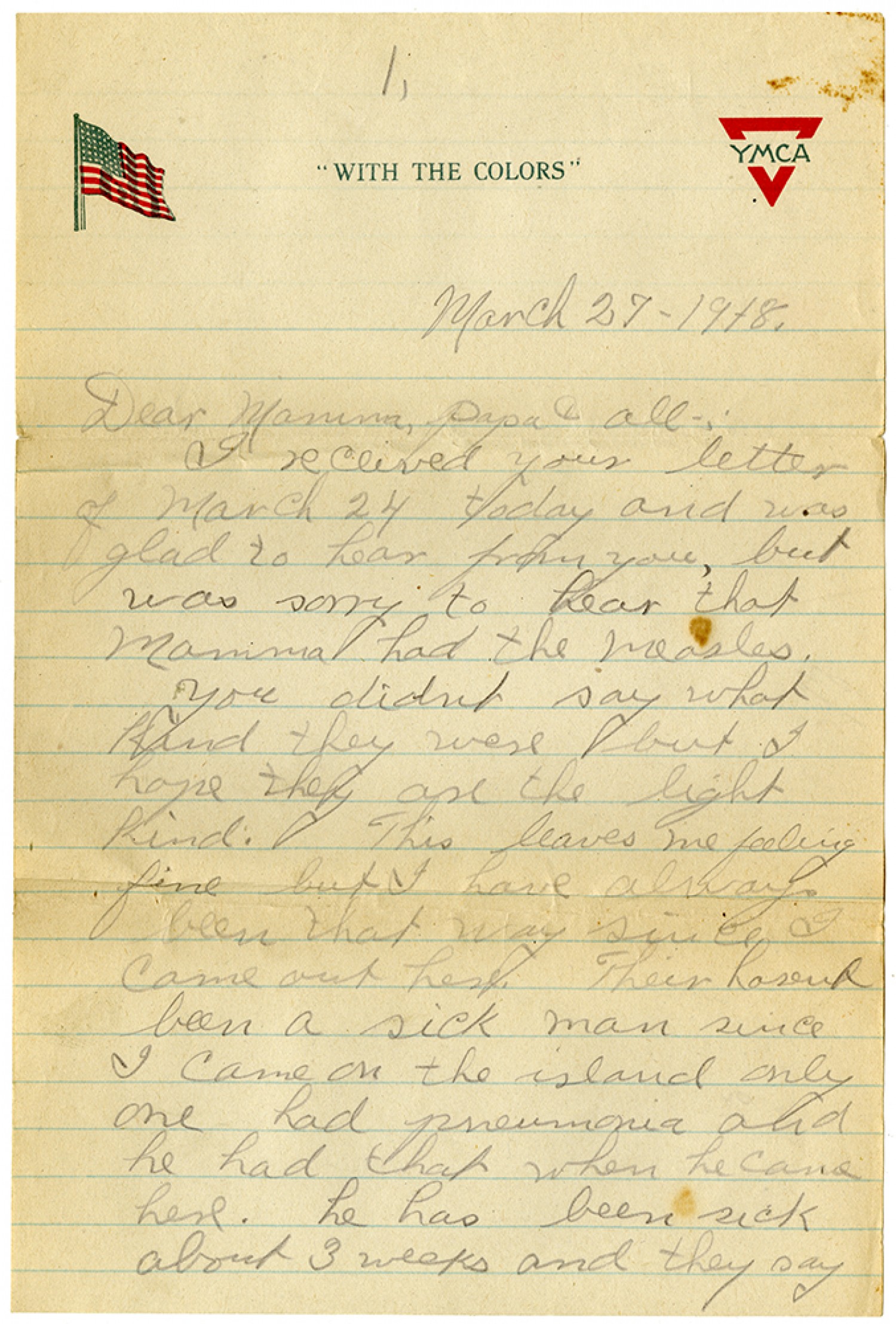 [YMCA letterhead][Page 1] March 27-1918. Dear Mamma, Papa & All-: I received your letter of March 24 today and was glad to hear from you, but was sorry to hear that Mamma had the measles. You didnt say what kind they were but I hope they are the light kind. This leaves me feeling fine but I have always been that way since I came out here. Their hasent been a sick man since I came on the island only one had pneumonia and he had that when he came here. he has been sick about 3 weeks and they say
