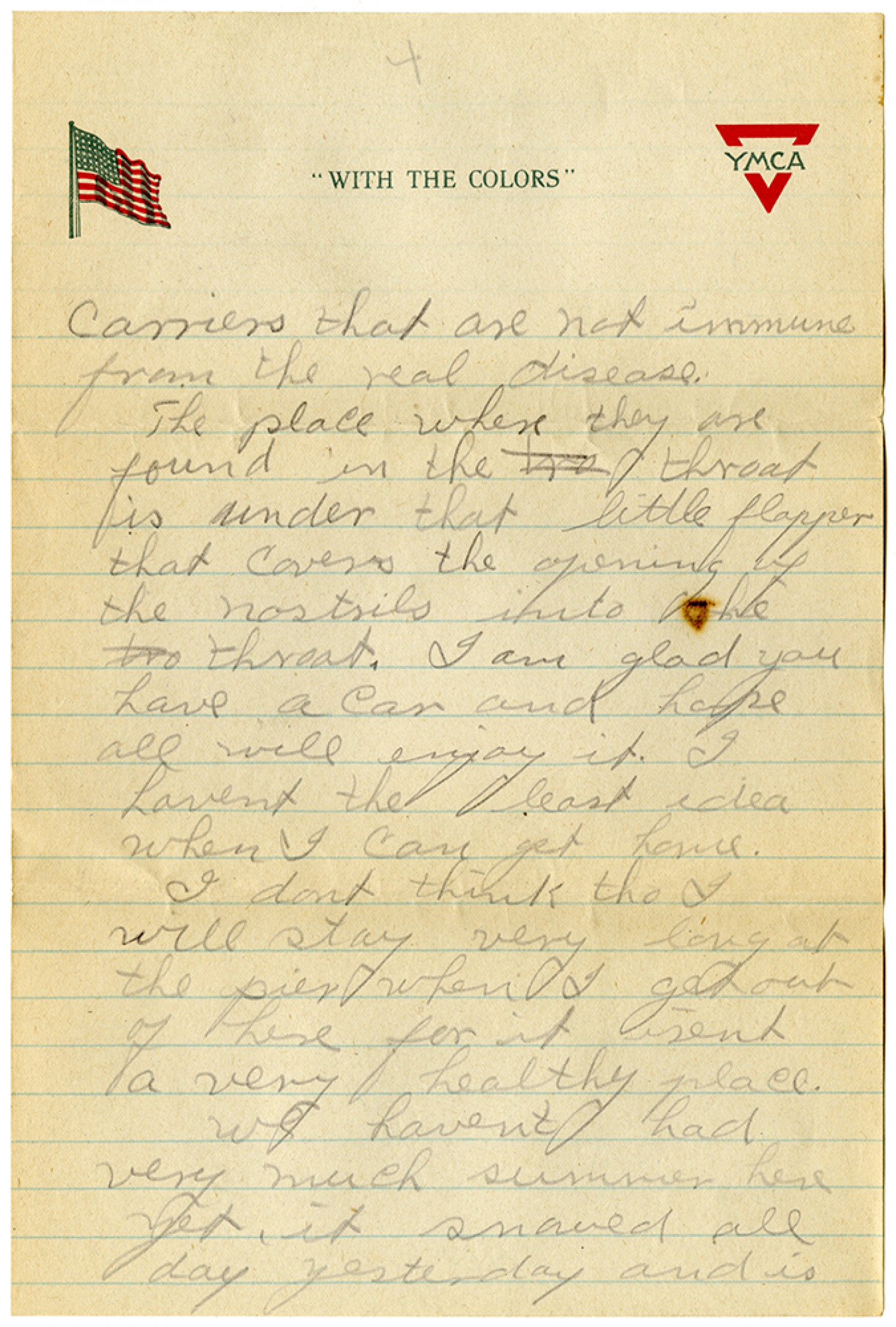 [YMCA letterhead][Page 4] carriers that are not immune from the real disease. The place when they are found in the throat is under that little flapper that covers the opening of the nostrils into the throat. I am glad you have a car and hope all will enjoy it. I havent the least idea when I can get home. I dont think tho I will stay very long at the pier when I get out of here for it isent a very healthy place. We havent had very much summer here yet. it snowed all day yesterday and is