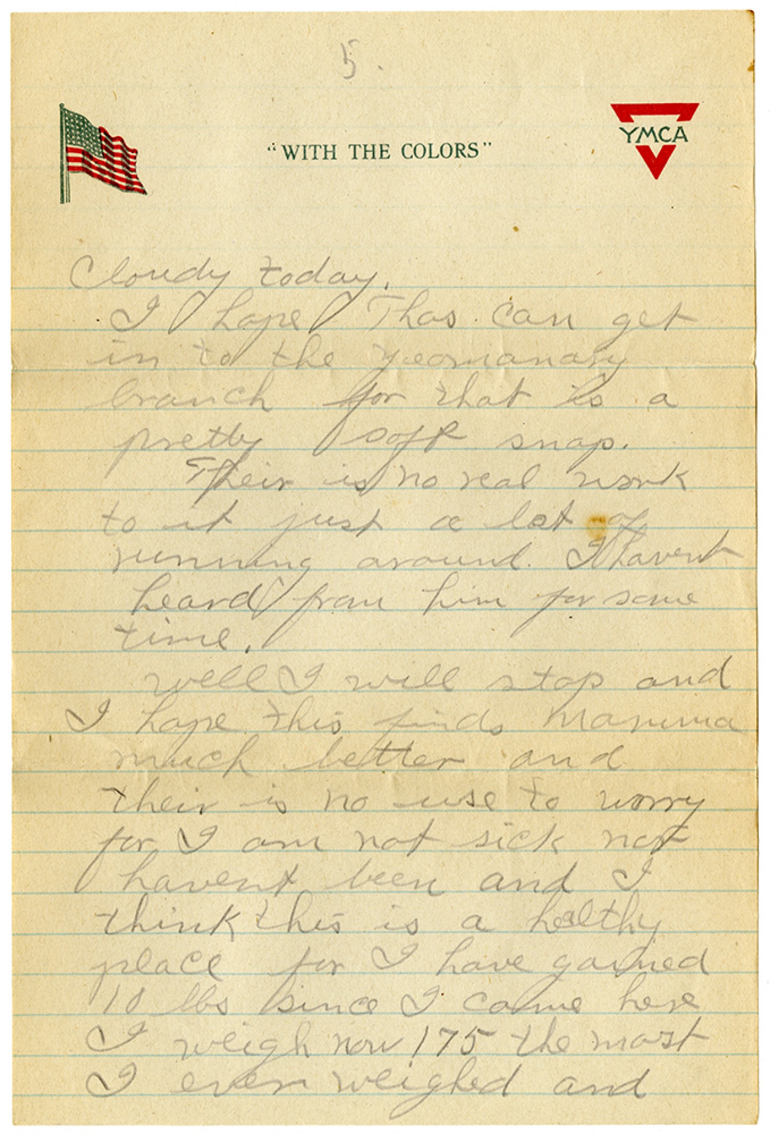 [YMCA letterhead][Page 5] cloudy today. I hope [Thomas] can get in to the yeomanary branch for that is a pretty soft snap. Their is no real work to it just a lot of running around. I havent heard from him for some time. Well I will stop and I hope this finds Mamma much better and their is no use to worry for I am not sick nor havent been and I think this is a helthy place for I have gained 10 lbs since I came here I weigh now 175 the most I ever weighed and