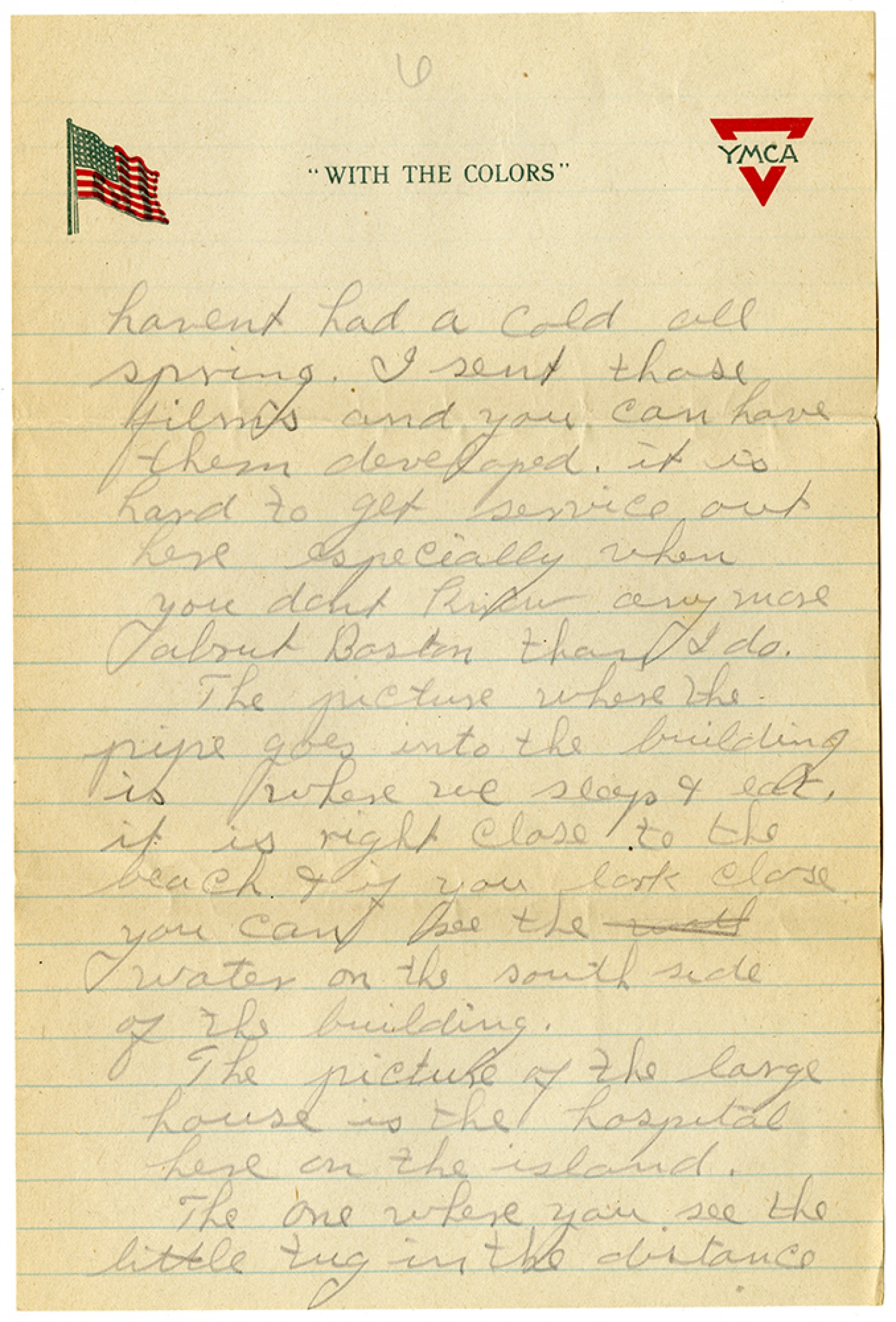 [YMCA letterhead][Page 6] havent had a cold all spring. I sent those films and you can have them developed. it is hard to get service out here especially when you dont know any more about Boston than I do. The juncture where the pipe goes into the building is where we sleep & eat. it is right close to the beach & if you look close you can see the water on the south side of the building. The picture of the large house is the hospital here on the island. The one where you see the little tug in the distance
