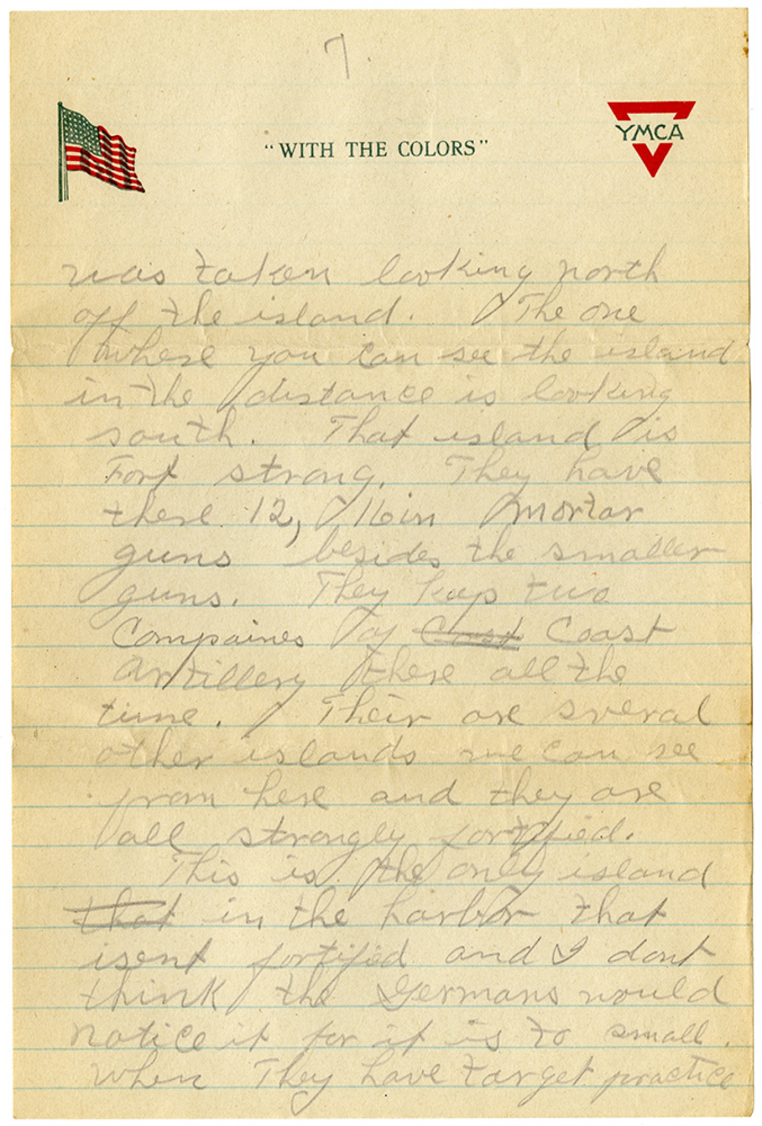 [YMCA letterhead][Page 7] was taken looking north off the island. The one where you can see the island in the distance is looking south. That island is Fort Strong. They have these 12, 16 in mortar guns besides the smaller guns. They keep two companies of coast artillery there all the time. Their are several other islands one can see from here and they are all strongly fortified. This is the only island in the harbor that isent fortified and I dont think the Germans would notice it for it is to small. Where They have target practice