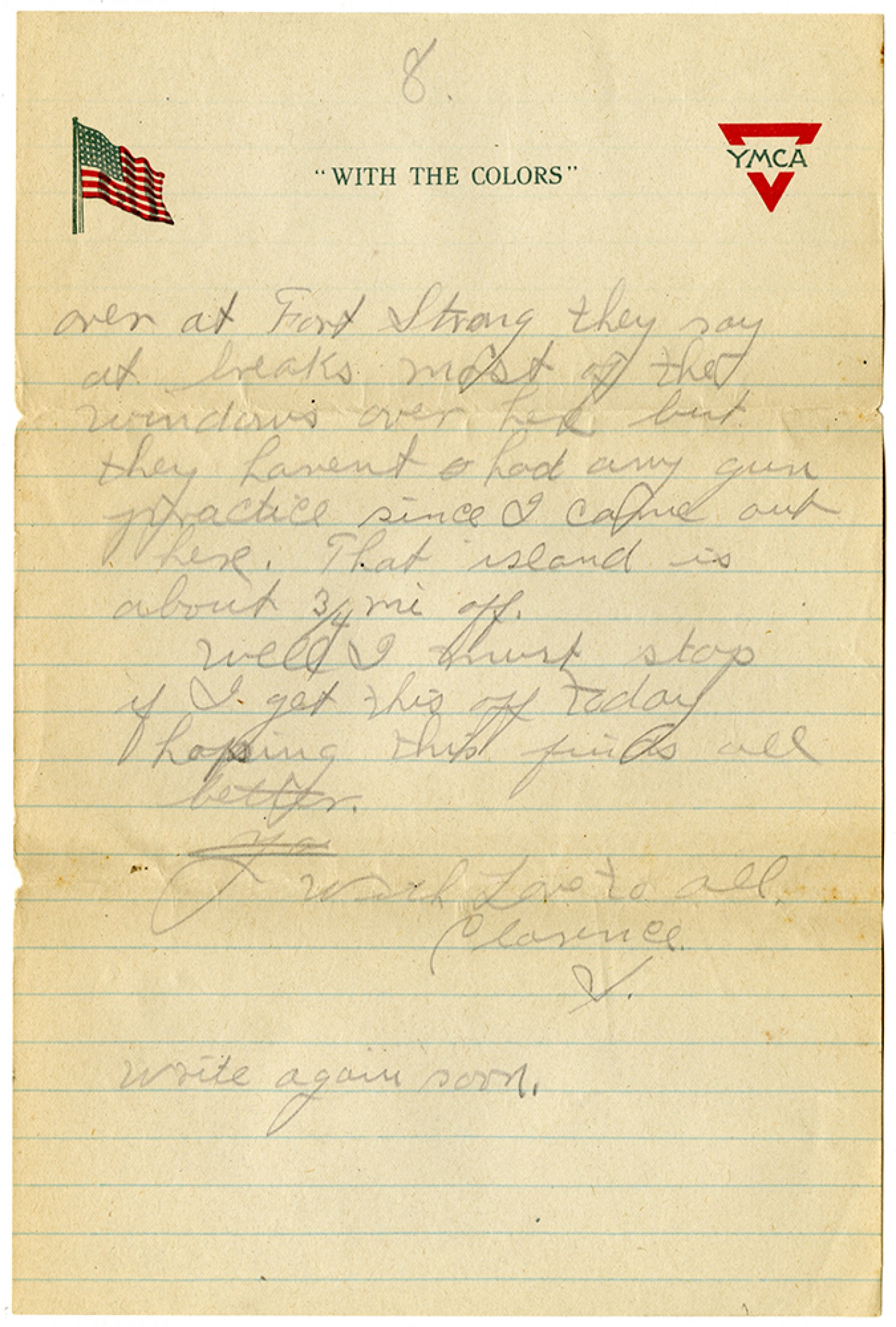 [YMCA letterhead][Page 8] over at Fort Strong they say at breaks most of the windows over hed but they havent had any gun practice since I came out here. That island is about ¾ mi off. well I must stop if I get this off today hoping this finds all better. With Love to all. Clarence S. Write again soon.