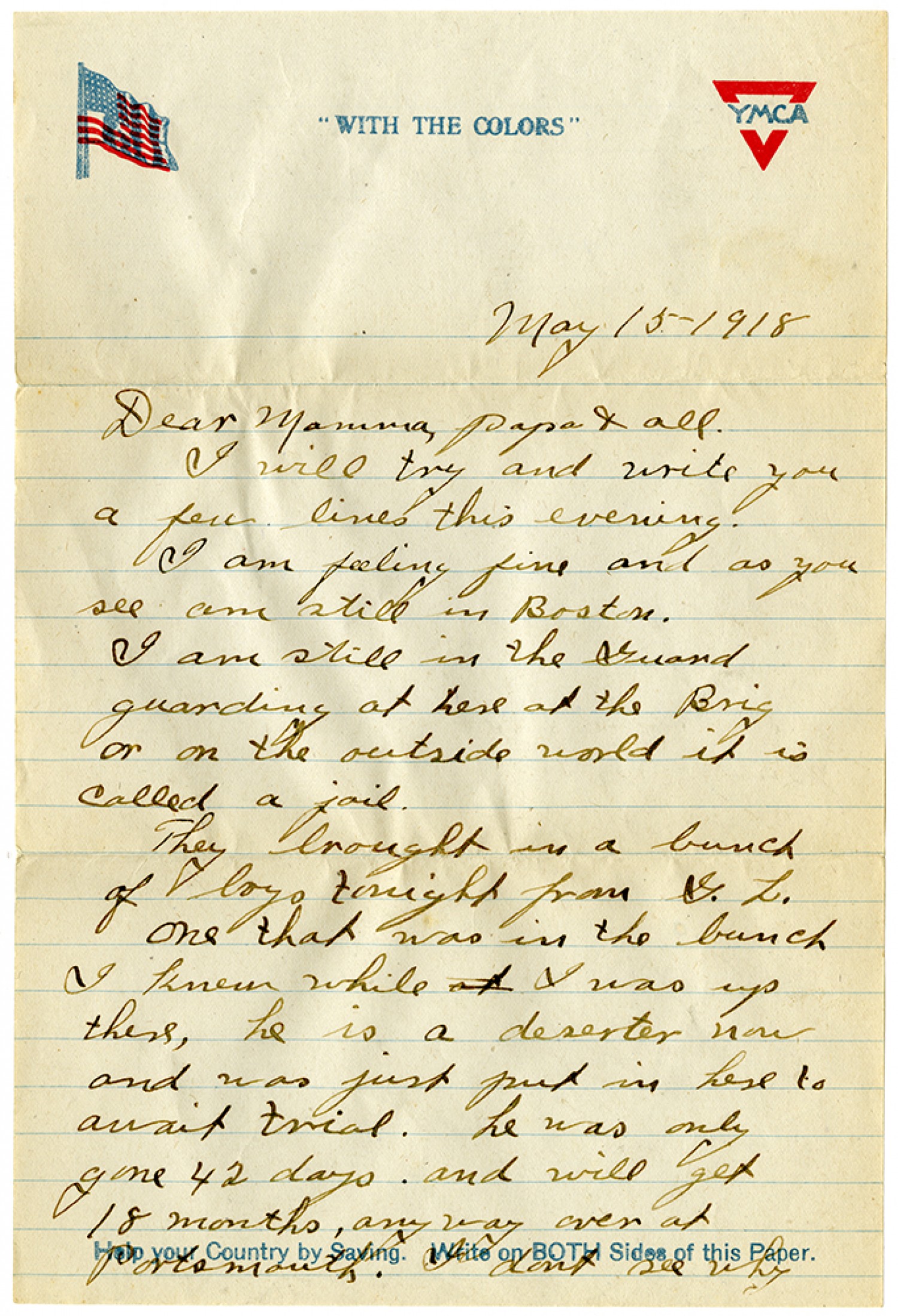 [YMCA letterhead] May 15 1918 Dear Mamma, Papa & all. I will try and write you a few lines this evening. I am feeling fine and as you see am still in Boston. I am still in the Guard guarding at here at the Brig or on the outside world it is called a jail. They brought in a bunch of boys tonight from [Great Lakes] one that was in the bunch I knew while I was up there, he is a deserter now and was just put in here to await trial. he was only gone 42 days and will get 18 months, any way over at Portsmouth. I dont see why