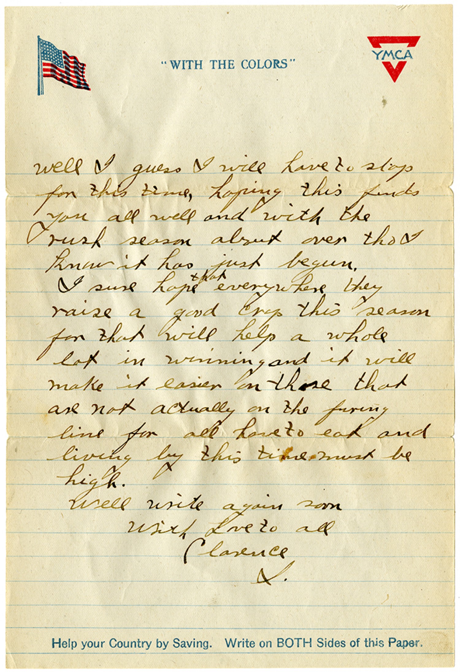[YMCA letterhead] well I guess I will have to stop for this time, hoping this finds you all well and with the rush season about over tho I know it has just begun. I sure hope that everywhere they raise a good crop this season for that will help a whole lot in winning and it will make it easier on those that are not actually on the firing line for all have to eat and living by this time must be high. Well write again soon With Love to all Clarence S.