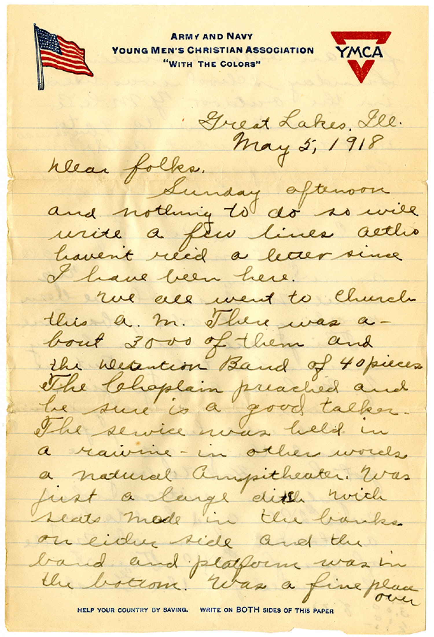 [YMCA letterhead] Great Lakes, [Illinois] May 5, 1918 Dear folks, Sunday afternoon and nothing to do so will write a few lines altho havent rec'd a letter since I have been here. We all went to church this a.m. There was about 3000 of them and the Detention Band of 40 pieces. The Chaplain preached and he sure is a good talker. The service was held in a ravine - in other words a natural Ampitheater. Was first a large ditch with seats made in the banks on either side and the band and platform was in the bottom. Was a fine place over