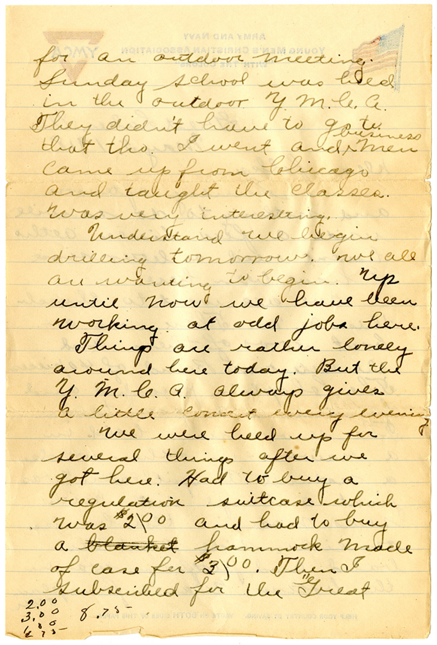 for an outdoor meeting. Sunday school was held in the outdoor Y.M.C.A. They didn't have to go to that tho. I went and business men came up from Chicago and taught the classes. Was very interesting. Understand we begin drilling tomorrow. We all are wanting to begin. Up until now we have been working at odd jobs here. Things are rather lonely around here today. But the Y.M.C.A. always gives a little concert every evening. We were held up for several things after we got here. Had to buy a regulation suitcase which was $2\00 and had to buy a hammock made of case fer $3\00. Then I subscribed for the "Great 2.00 3.00 1.00 2.75 8.75
