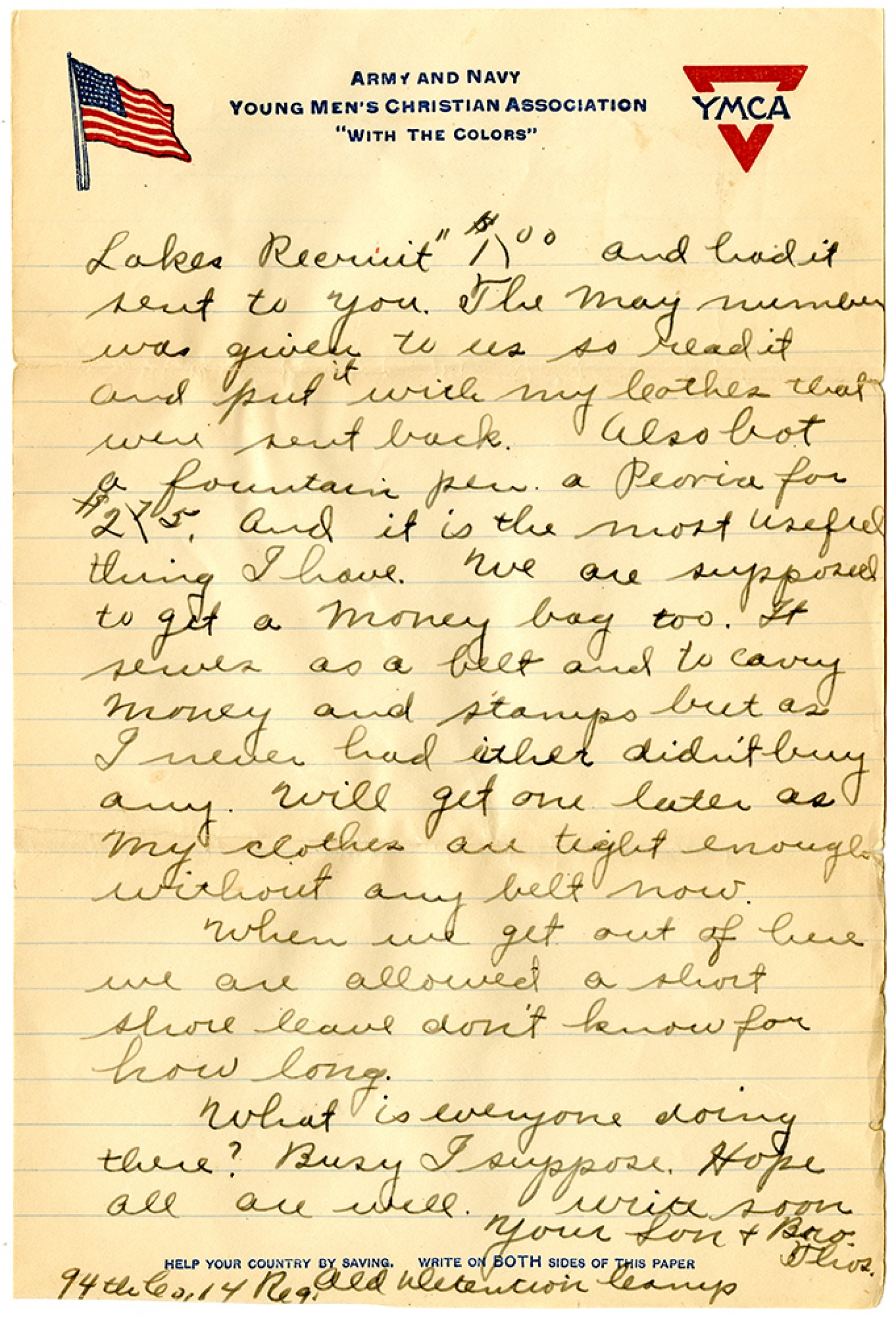 [YMCA letterhead]Lakes Recruit" $1\00 and had it sent to you. The May number was given to us so read it and put it with my clothes that were sent back. Also bot a fountain pen a Peoria for $2.75 and it is the most useful thing I have. We are supposed to get a money bag too. It serves as a belt and to carry money and stamps but as I never had either didn't buy any. Will get one later as my clothes are tight enough without any belt now. When we get out of here we are allowed a short shore leave don't know for how long. What is everyone doing there? Busy I suppose. Hope all are well. Write soon Your Son & Bro. [Thomas] 94th Co. 14 Reg. Old Detention Camp