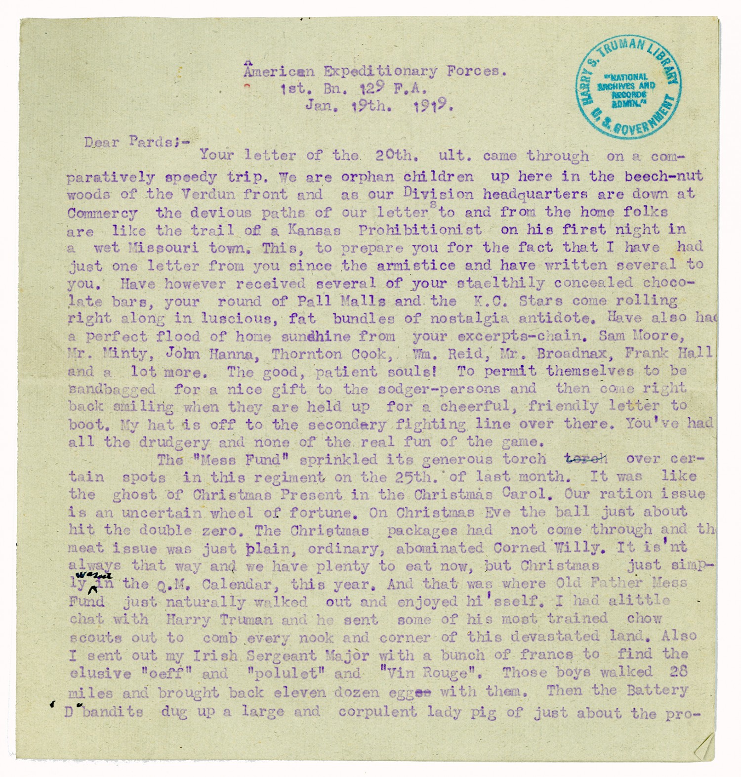 American Expeditionary Forces. 1st. Bn. 129 F.A. [January] 19th. 1919. Dear Pards;- Your letter of the 20th. ult. came through on a comparatively speedy trip. We are orphan children up here in the beech-nut woods of the Verdun front and as our Division headquarters are down at Commercy the devious paths of our letters to and from the home folks are like the trail of a Kansas Prohibitionist on his first night in a wet Missouri town. This, to prepare you for the fact that I have had just one letter from you since the armistice and have written several to you. Have however received several of your staelthily concealed chocolate bars, your round of Pall Malls and the K.C. [Kansas City] Stars come rolling right along in luscious, fat bundles of nostalgia antidote. Have also had a perfect flood of home sunshine from your excerpts-chain. Sam Moore, Mr. Minty, John Hanna, Thornton Cook, Wm. Reid, Mr. Broadnax, Frank Hall and a lot more. The good, patient souls! To permit themselves to be sandbagged for a nice gift to the sodger-persons and then come right back smiling when they are held up for a cheerful, friendly letter to boot. My hat is off to the secondary fighting line over there. You’ve had all the drudgery and none of the real fun of the game. The “Mess Fund” sprinkled its generous torch over certain spots in this regiment on the 25th. of last month. It was like the ghost of Christmas Present in the Christmas Carol. Our ration issue is an uncertain wheel of fortune. On Christmas Eve the ball just about hit the double zero. The Christmas packages had not come through and the meat issue was just plain, ordinary, abominated Corned Willy. It is’nt always that way and we have plenty to eat now, but Christmas just simply wasn’t in the Q.M. Calendar, this year. And that was where Old Father Mess Fund just naturally walked out and enjoyed hi’sself. I had alittle chat with Harry Truman and he sent some of his most trained chow scouts out to comb every nook and corner of this devastated land. Also I sent out my Irish Sergeant Major with a bunch of francs to fine the elusive “eoff” and “polulet” and “Vin Rouge”. Those boys walked 28 miles and brought back eleven dozen eggs with them. Then the Battery “D” bandits dug up a large and corpulent lady pig of just about the pro- [proportions]