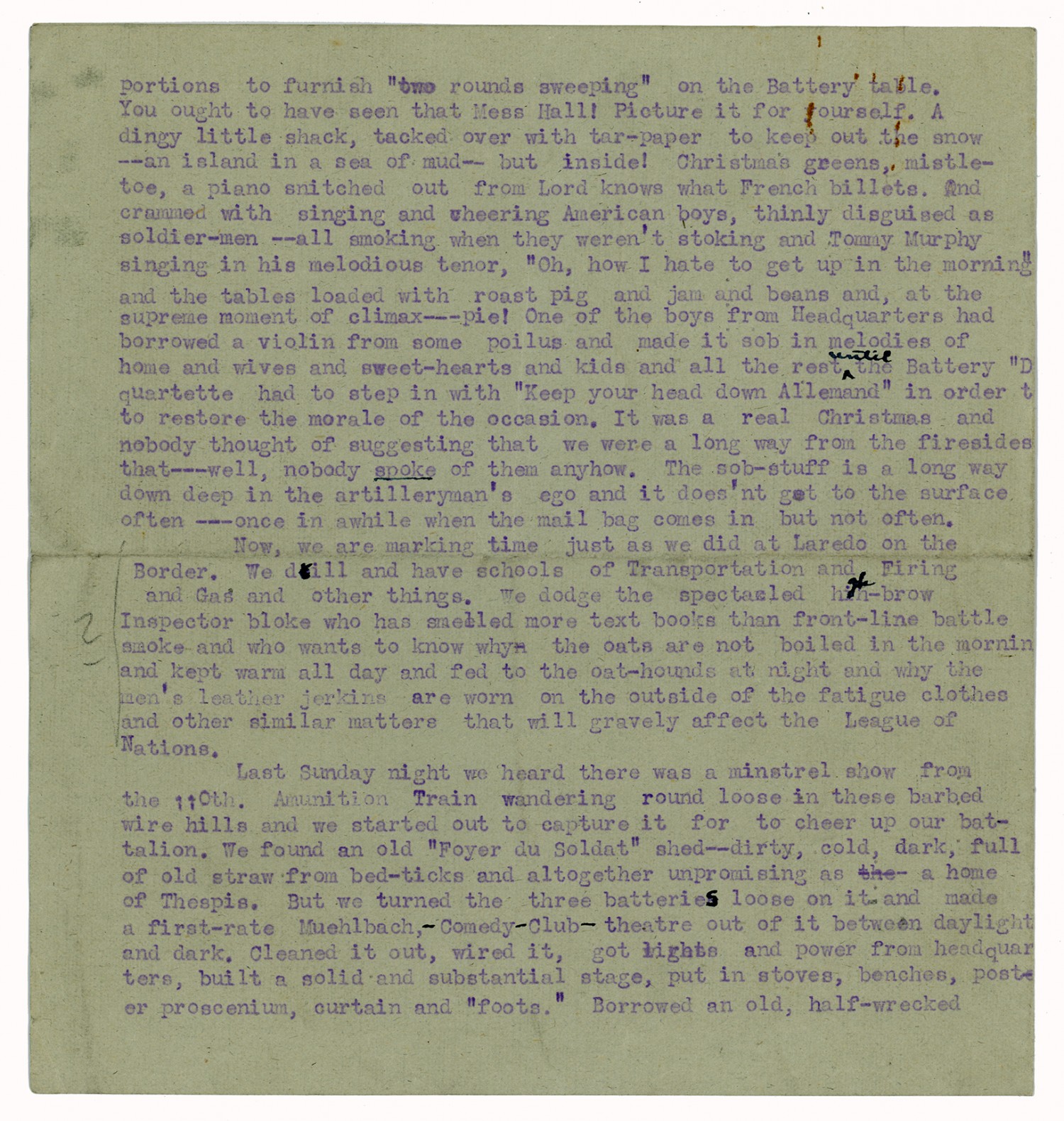 [proportions] to furnish “two rounds sweeping” on the Battery table. You ought to have seen that Mess Hall! Picture it for yourself. A dingy little shack, tacked over with tar-paper to keep out the snow --an island in a sea of mud-- but inside! Christmas greens, mistletoe, a piano snitched out from Lord knows what French billets. And crammed with singing and cheering American boys, thinly disguised as soldier-men --all smoking when they weren’t stoking and Tommy Murphy singing in his melodious tenor, “Oh, how I hate to get up in the morning” and the tables loaded with roast pig and jam and beans and, at the supreme moment of climax---pie! One of the bows from Headquarters had borrowed a violin from some poilus and made it sob in melodies of home and wives and sweet-hearts and kids and all the rest until the Battery “D quartette had to step in with “Keep your head down Allemand” in order t to restore the morale of the occasion. It was a real Christmas and nobody thought of suggesting that we were a long way from the firesides that---well, nobody spoke of them anyhow. The sob-stuff is a long way down deep in the artilleryman’s ego and it does’nt get to the surface often ---once in awhile when the mail bag comes in but not often. Now we are making time just as we did at Laredo on the Border. We drill and have schools of Transportation and Firing and Gas and other things. We dodge the spectacled high-brow Inspector bloke who has smelled more text books than front-line battle smoke and who wants to know why the oats are not boiled in the morning and kept warm all day and fed to the oat-hounds at night and why the men’s leather jerkins are worn on the outside of the fatigue clothes and other similar matters that will gravely affect the League of Nations. Last Sunday night we heard there was a minstrel show from the 110th. Amunition Train wandering round loose in these barbed wire hills and we started out to capture it for to cheer up our battalion. We found an old “Foyer du Soldat” shed--dirty, cold, dark, full of old straw from bed-ticks and altogether unpromising as a home of Thespis. But we turned the three batteries loose on it and made a first-rate Muehlbach, -Comedy-Club-theatre out of it between daylight and dark. Cleaned it out, wired it, got lights and power from headquarters, built a solid and substantial stage, put in stoves, benches, poster proscenium, curtain and “foots.” Borrowed an old, half-wrecked