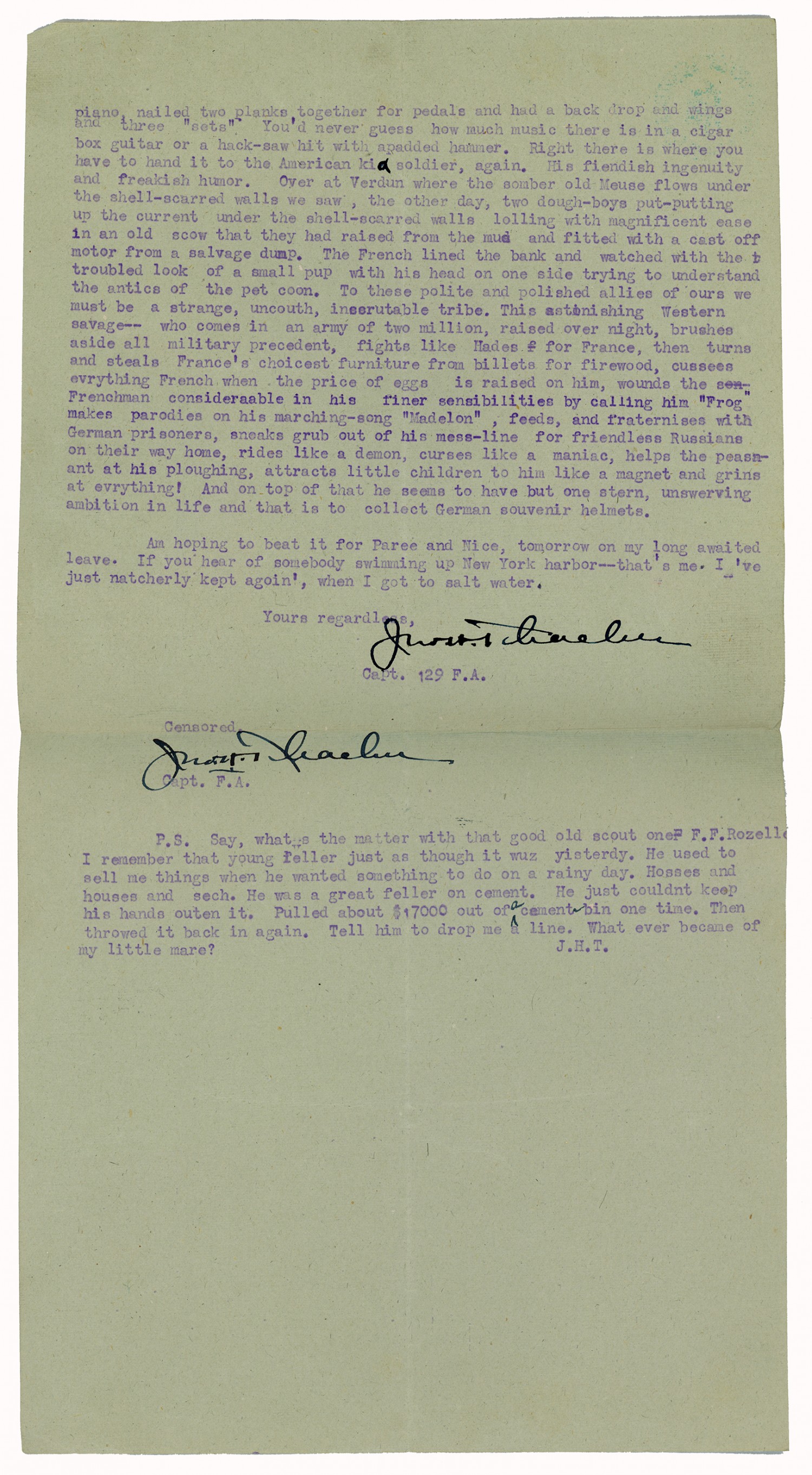 piano, nailed two planks together for pedals and had a back drop and wings and three “sets” You’d never guess how much music there is in a cigar box guitar or a hack-saw with apadded hammer. Right there is where you have to hand it to the American kid soldier, again. His fiendish ingenuity and freakish humor. Over at Verdun where the somber old Meuse flows under the shell-scarred walls we saw, the other day, two dough-boys put-putting up the current under the shell-scarred walls lolling with magnificent ease in an old scow that they had raised from the mud and fitted with a cast off motor from a salvage dump. The French lined the bank and watched with the troubled look of a small pup with his head on one side trying to understand the antics of the pet coon. To these polite and polished allies of ours we must be a strange, uncouth, inscrutable tribe. This astonishing Western savage-- who comes in an army of two million, raised over night, brushes aside all military precedent, fights like Hades for France, then turns and steals France’s choicest furniture from billets for firewood, cussees everything French when the price of eggs is raised on him, wounds the Frenchmen consideraable in his finer sensibilities by calling him “Frog” makes parodies on his marching-song “Madelon”, feeds, and fraternises with German prisoners, sneaks grub out of his mess-line for friendless Russians on their way home, rides like a demon, curses like a maniac, helps the peasant at his ploughing, attracts little children to him like a magnet and grins at everything! And on top of that he seems to have but one stern, unswerving ambition in life and that is to collect German souvenir helmets. Am hoping to beat it for Paree and Nice, tomorrow on my long awaited leave. If you hear of somebody swimming up New York harbor--that’s me. I’ve just natcherly kept agoin’, when I got to salt water. Yours regardless, John Thatcher Capt. 129 F.A. Censored. [signature illegible] Capt. F.A. P.S. Say, whats the matter with that good old scout one F.F. Rozelle I remember that young feller just as though it wuz yisterdy. He used to sell me things when he wanted something to do on a rainy day. Hosses and houses and sech. He was a great feller on cement. He just coudnt keep his hands outen it. Pulled about $17000 out of a cement bin one time. Then throwed it back in again. Tell him to drop me a line. What ever became of my little mare? J.H.T.