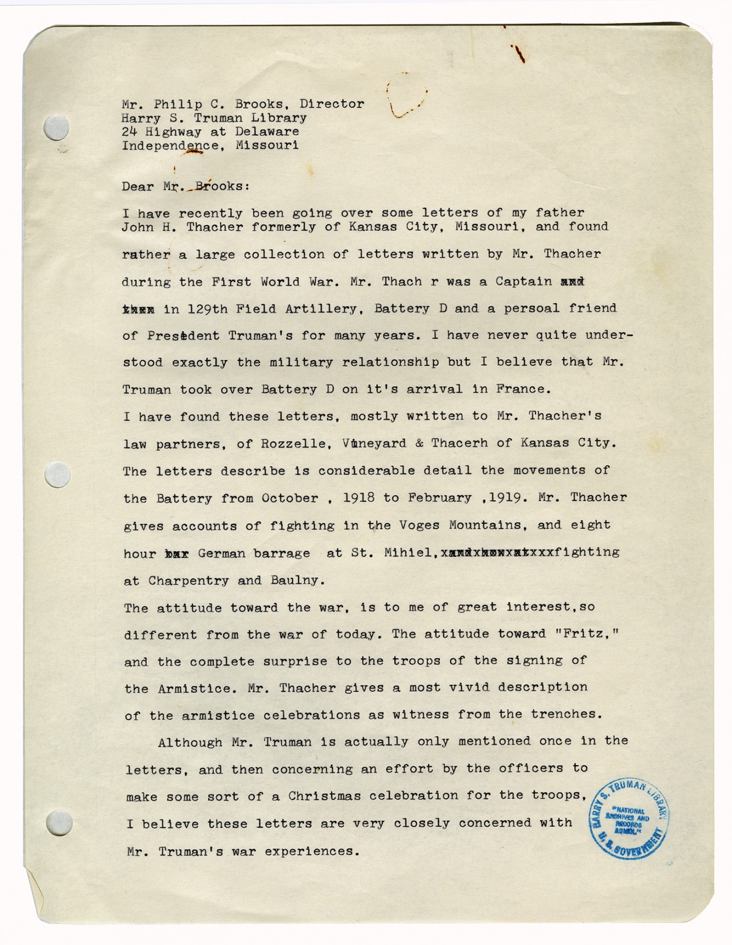 Letter to Philip C. Brooks, the director of the Harry S. Truman Library, most likely from one of Captain John H. Thatcher's children. The author informed Brooks of papers they had from their father during his service and asked if the museum would be interested in possessing them. Before the war, Thacher worked as an attorney with the firm Rozelle, Vineyard, Thacher, and Boys. He served on the Mexican Border and was later drafted into the Federal Army as Captain of the 129th Field Artillery. After Harry S. Truman took command of the 129th Field Artillery, Thacher was appointed adjutant of the 1st Battalion of the 129th Field Artillery , and later assumed command of the 110th Ammunition Train of the 35th Division.