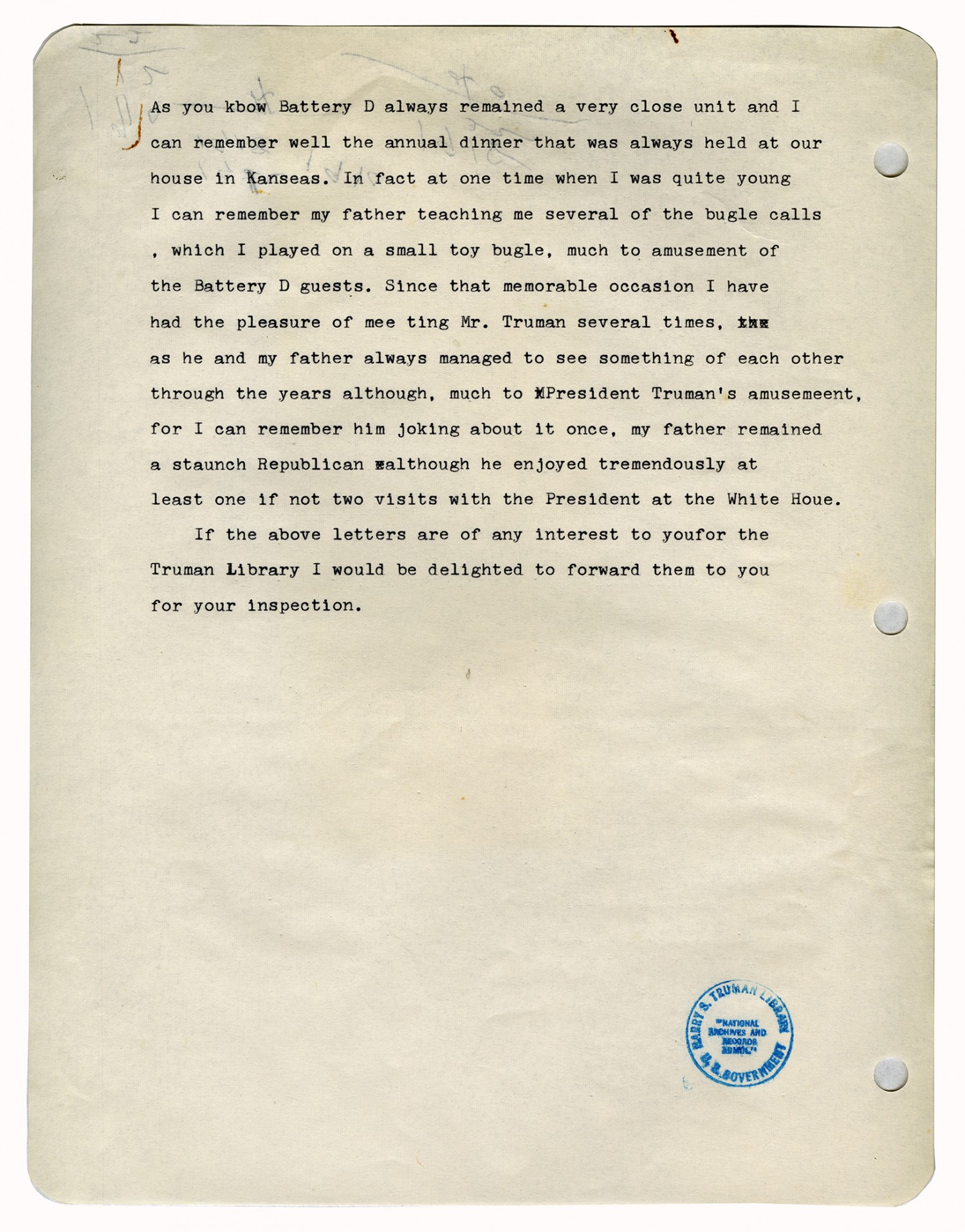 As you kbow Battery D always remained a very close unit and I can remember well the annual dinner that was always held at our house in Kanseas. In fact at one time when I was quite young I can remember my father teaching me several of the bugle calls, which I played on a small toy bugle, much to amusement of the Battery D guests. Since that memorable occasion I have had the pleasure of meeting Mr. Truman several times, as he and my father always managed to see something of each other through the years although, much to President Truman’s amusement, for I can remember him joking about it once, my father remained a staunch Republican although he enjoyed tremendously at least one if not two visits with the President at the White Houe. If the above letters are of any interest to youfor the Truman Library I would be delighted to forward them to you for your inspection.