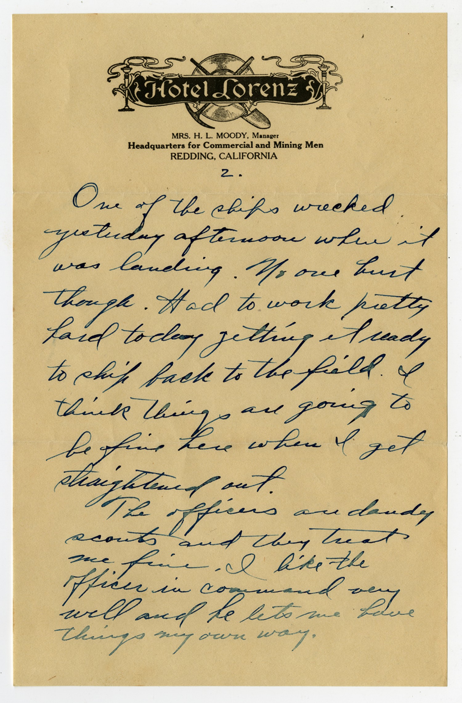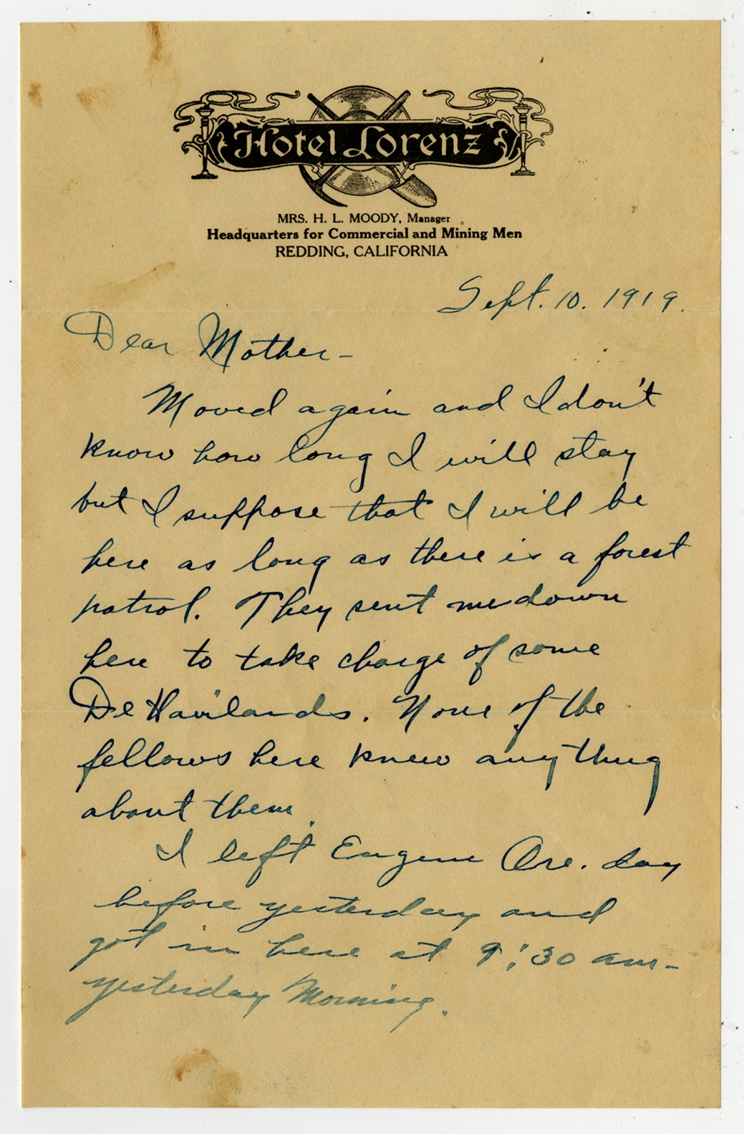 HOTEL LORENZ MRS. H.L. MOODY, Manager Headquarters for Commercial and Mining Men Redding, California Sept, 10, 1919 Dear Mother, Moved again and I don’t know how long I will stay but I suppose that I will be here as long as there is a forest patrol. They send me down here to take charge of some De Havillands. None of the fellows here knew anything about them. I left Eugene Ore. Day before yesterday and got in here at 9:30 am yesterday morning.