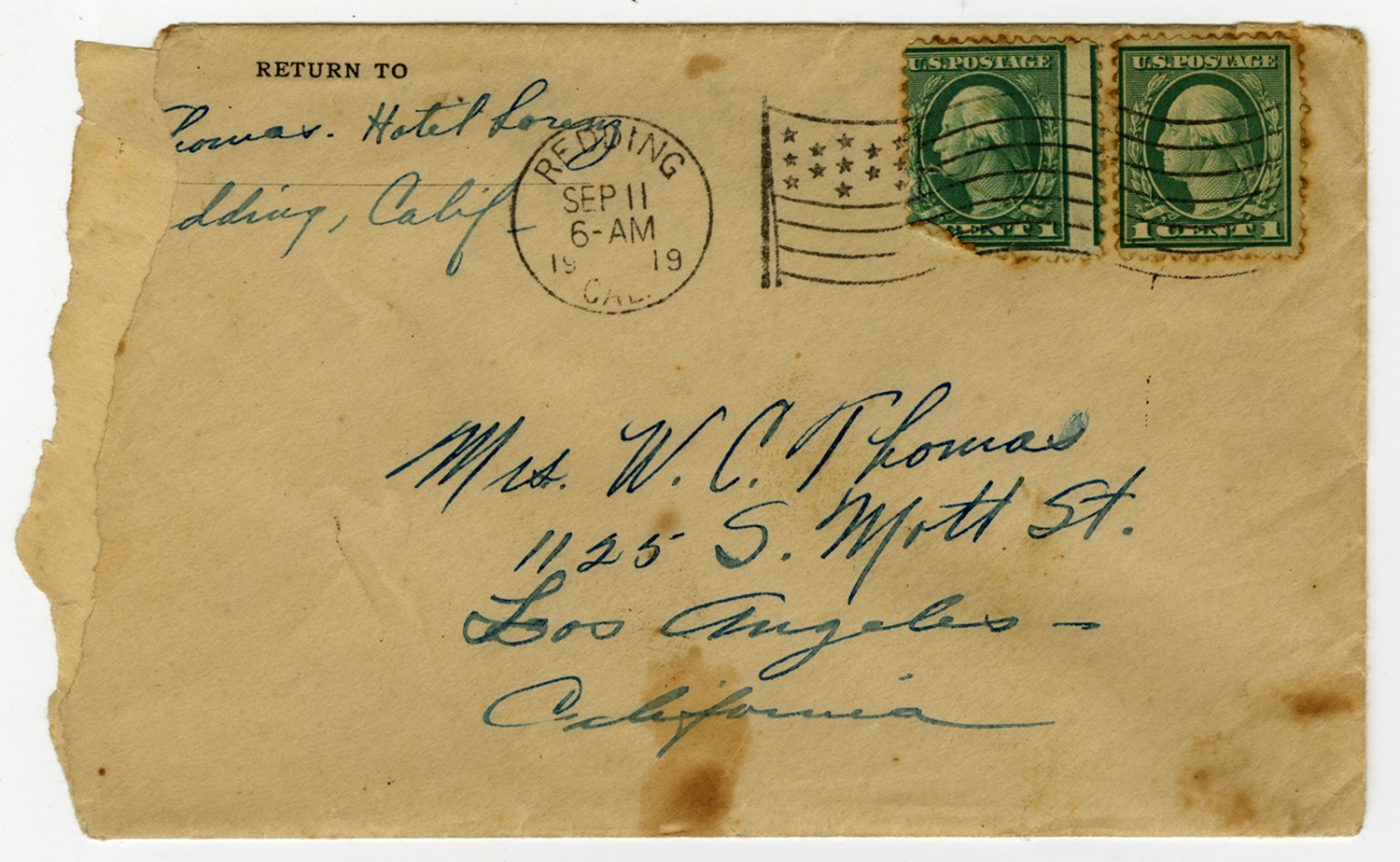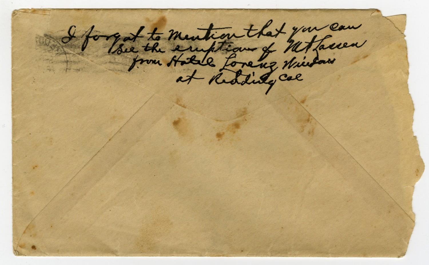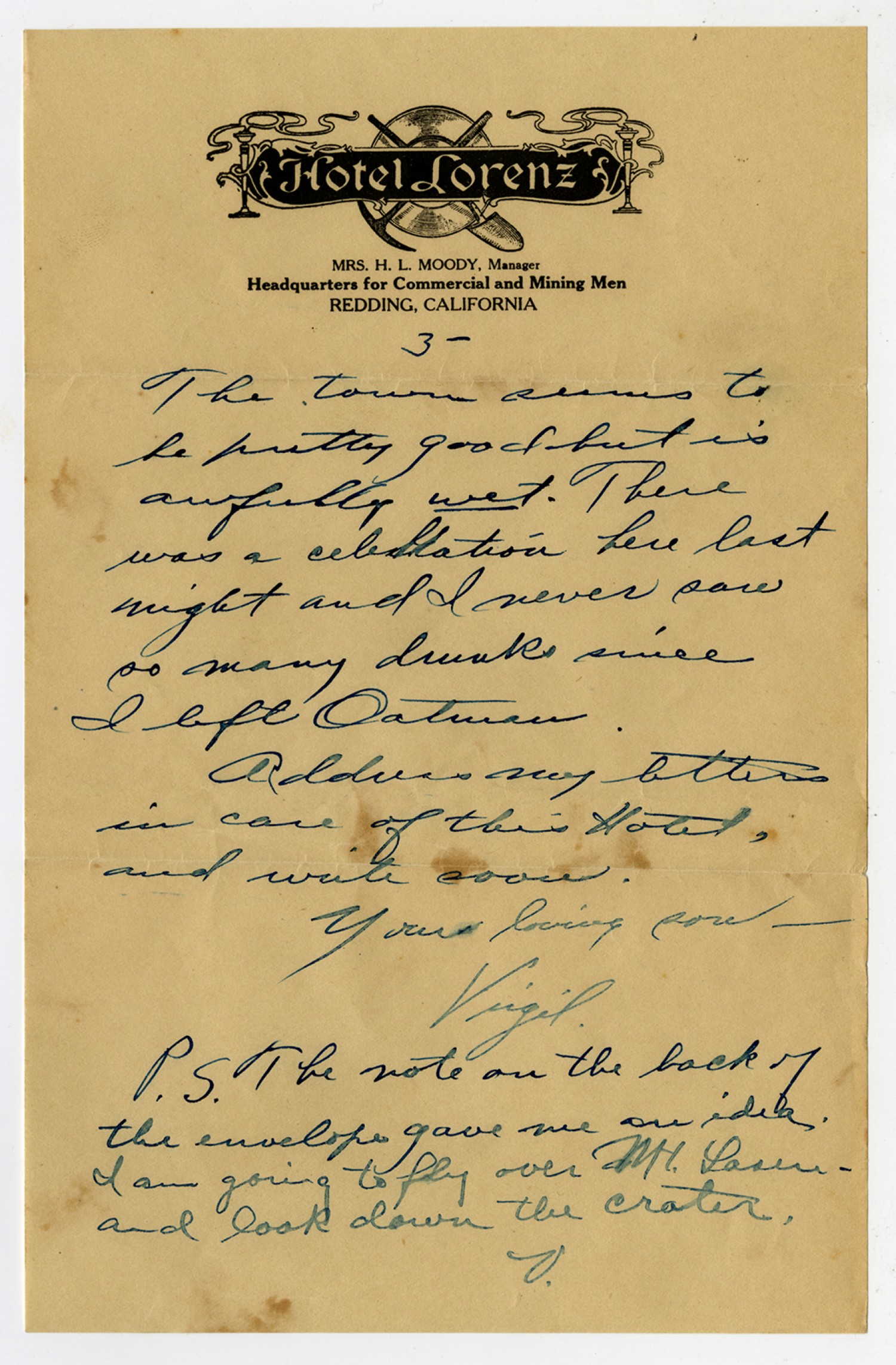 The town seems to be pretty good but is awfully wet. There was a celebration here last night and never saw so many drunks since I left [illegible] Address my letters care of this hotel and write soon. Your Loving Son – Virgil P.S. The note on the back of the envelope gave me an idea. I am going to fly over Mt. Lassen and look down the crater. V.
