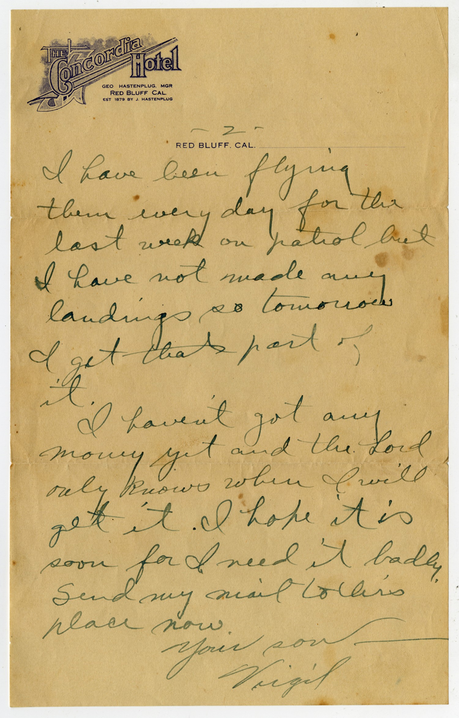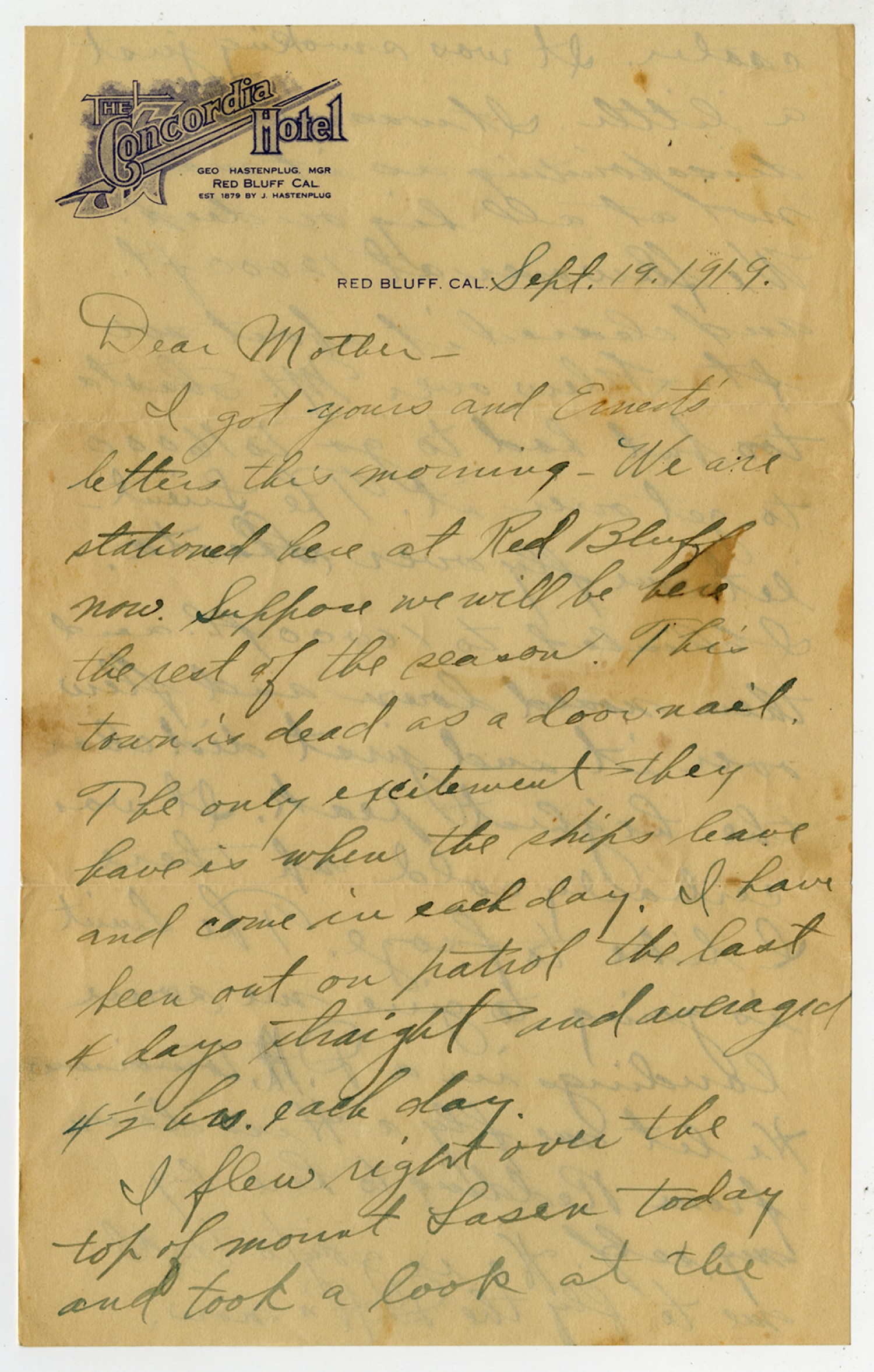 THE CONCORDIA HOTEL GEO HASTENPLUG MGR RED BLUFF CAL EST 1879 BY J HASTENPLUG RED BLUFF. CAL Sept. 19, 1919. Dear Mother – I got yours and Ernesto letters this morning – We are stationed here at Red Bluff now. Suppose we will be here the rest of the season. This tour is dead as a door nail. The only excitement they have is when the ships leave and come in each day. I have been out on patrol the last 4 days straight and averaged 4 ½ hrs. each day. I flew right over the top of mount [Lassen] today and took a look at the