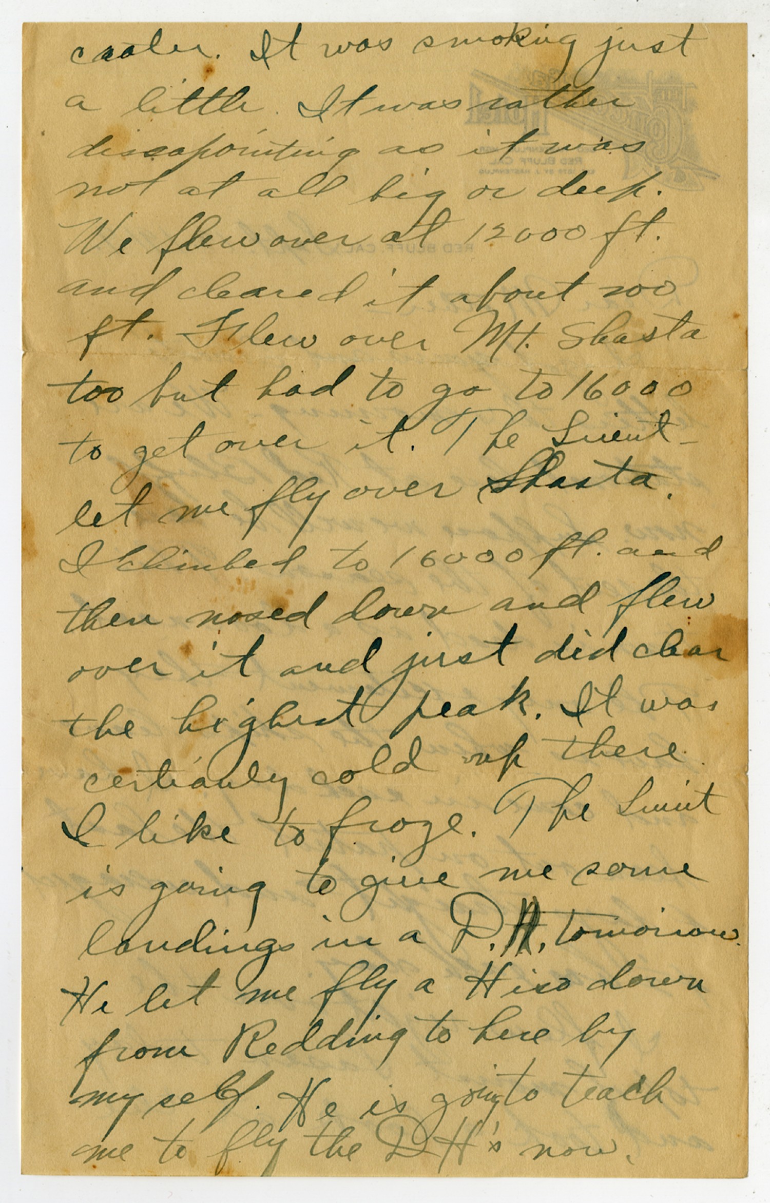 crater. It was smoking just a little. It was rather disappointing however as it was not at all big or deep. We flew over at 15,000 ft. and cleared it about 200 ft. Flew over Mt. Shasta too but had to go to 16000 to get over it. The Lieut let me fly over Shasta. I climbed to 16000 ft. and then nosed down and flew over it and just did clear the highest peak. It was certainly cold up there. I like to froze. The Lieut is going to give me some landings in a P.H. tomorrow. He let me fly a [illegible] down from Redding to here by myself. He is going to teach me to fly the DH’s now.