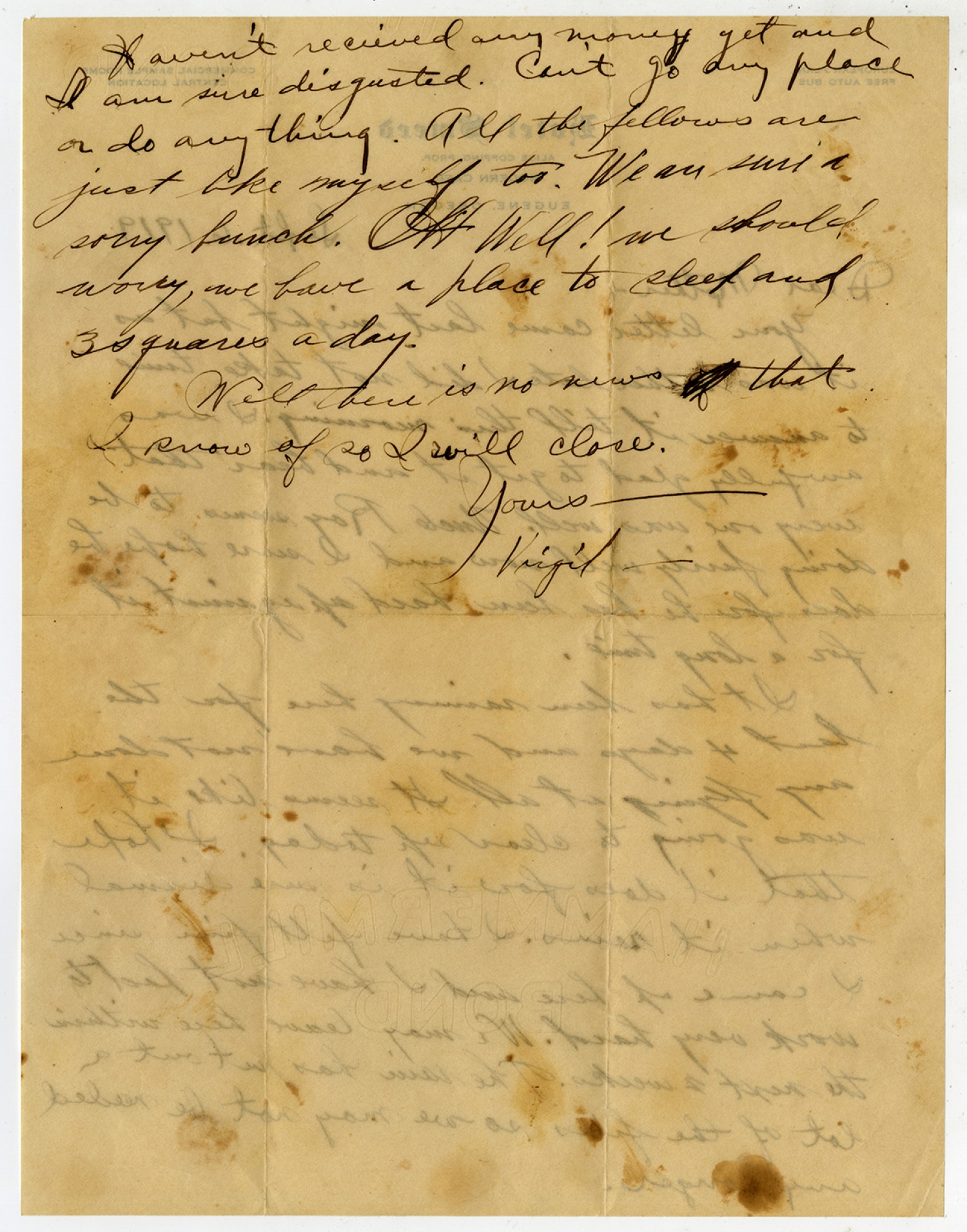Haven’t received any money yet and I am sure disgusted. Can’t go any place or do anything. All the fellows are just like myself too. We are sure a sorry bunch. Oh Well! We should worry, we have a place to sleep and 3 squares a day. Well there is no news that I know of so I will close. Yours Virgil.