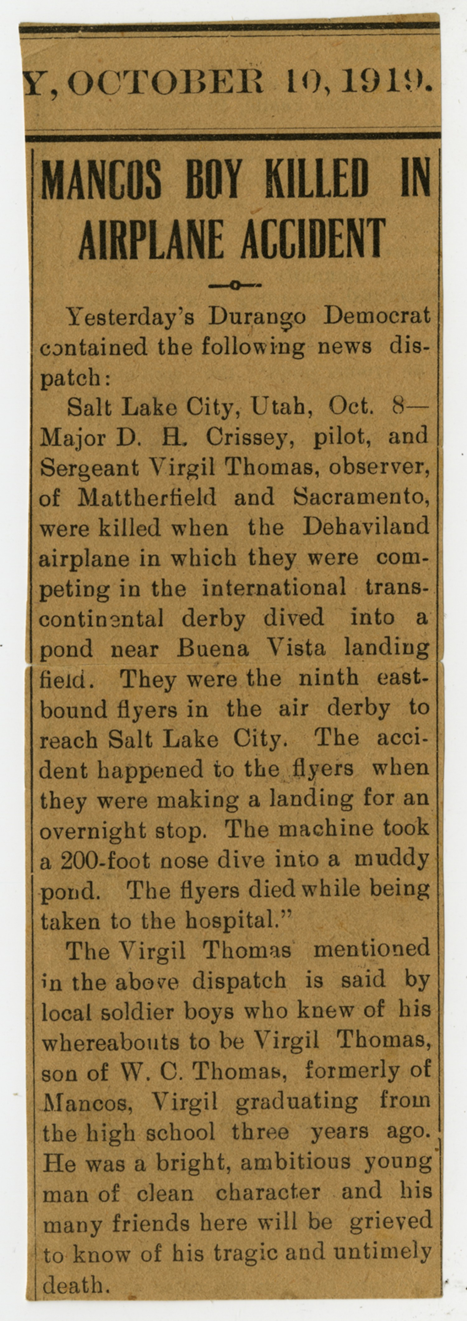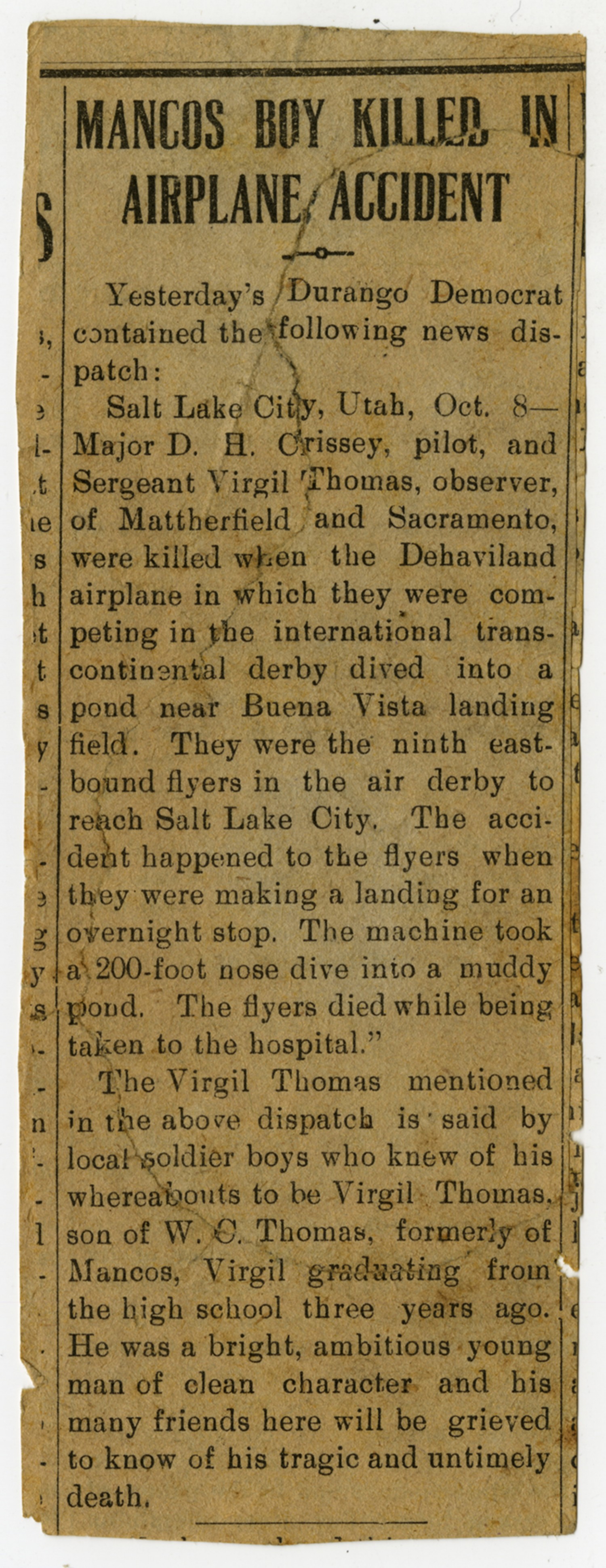 | Description | <p>This newspaper article, original printed in the Durango Democrat on October 9, 1919, it details the death of James Virgil Thomas in an aviation accident during a transcontinental derby. </p> |
