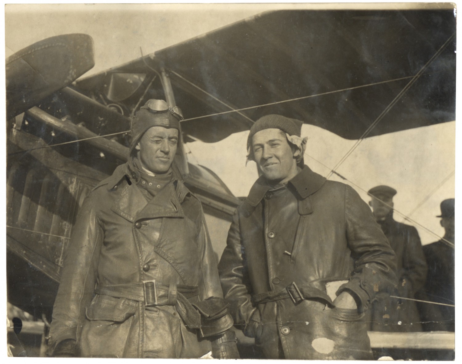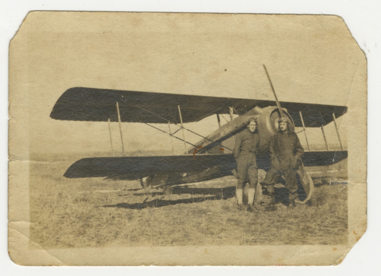 [On back of image] Virgil with the Lieut. he flies with in front of one of the Hisso Suizo machines on the landing field at North Island