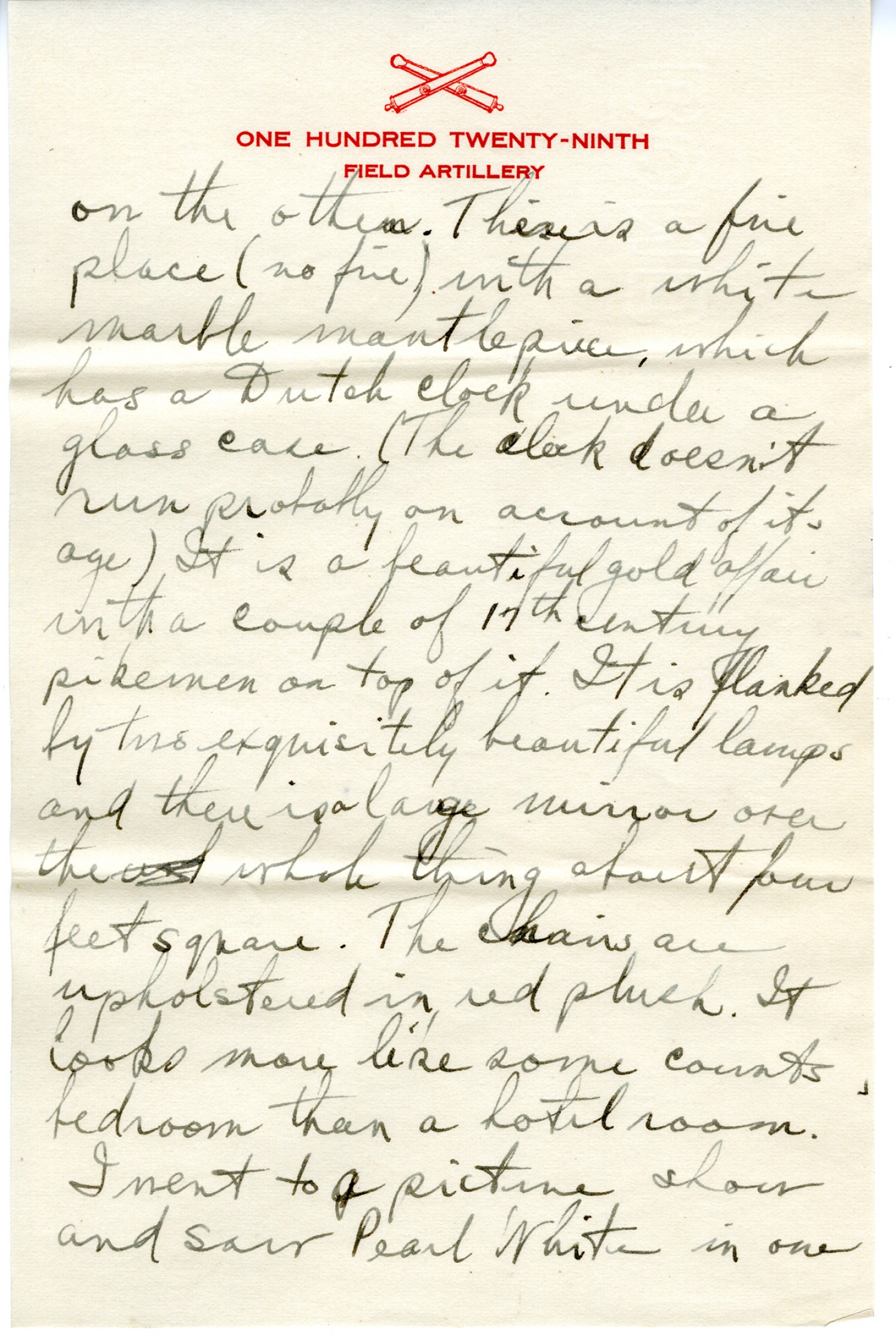 [ONE HUNDRED TWENTY-NINTH FIELD ARTILLERY letterhead] on the other. There is a fire place (no fire) with a white marble mantelpiece, which has a Dutch clock under a glass case. (The clock doesn't run, probably on account of its age.) It is a beautiful gold affair with a couple of 17th century pikemen on top of it. It is flanked by two exquisitely beautiful lamps and there is a large mirror over the whole thing about four feet square. The chairs are upholstered in red plush. It looks more like some count's bedroom than a hotel room. I went to a picture show and saw Pearl White in one