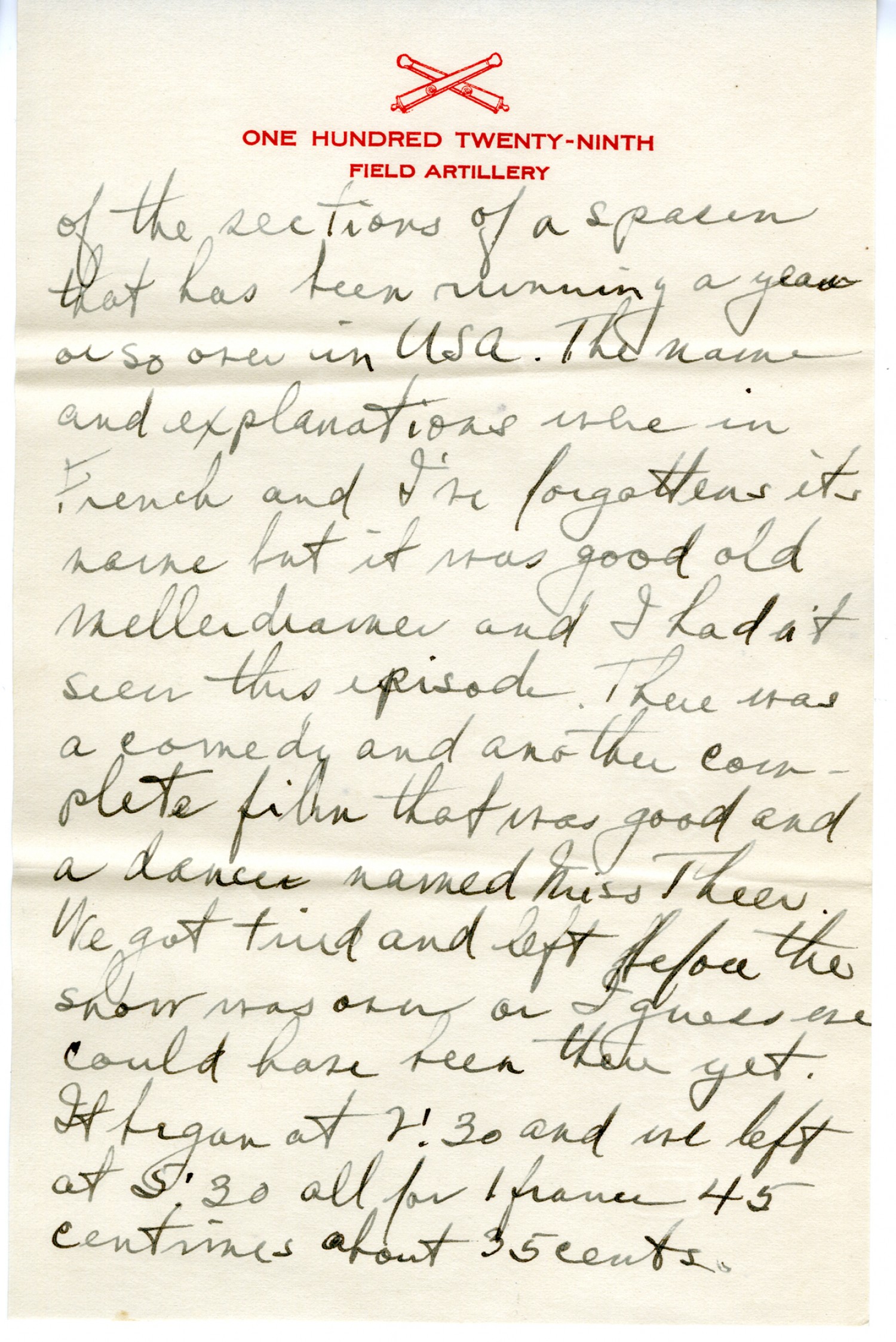 [ONE HUNDRED TWENTY-NINTH FIELD ARTILLERY letterhead]of the sections of a spasm that has been running a year or so over in U.S.A. The name and explanations were in French and I've forgotten its name but it was good old mellerdramer and I had not seen this episode. There was a comedy and another complete film that was good and a dancer named Miss Theer. We got tired and left before the show was over or I guess we could have been there yet. It began at 2:30 and we left at 5:30 all for 1 franc 45 centimes about 35 cents.