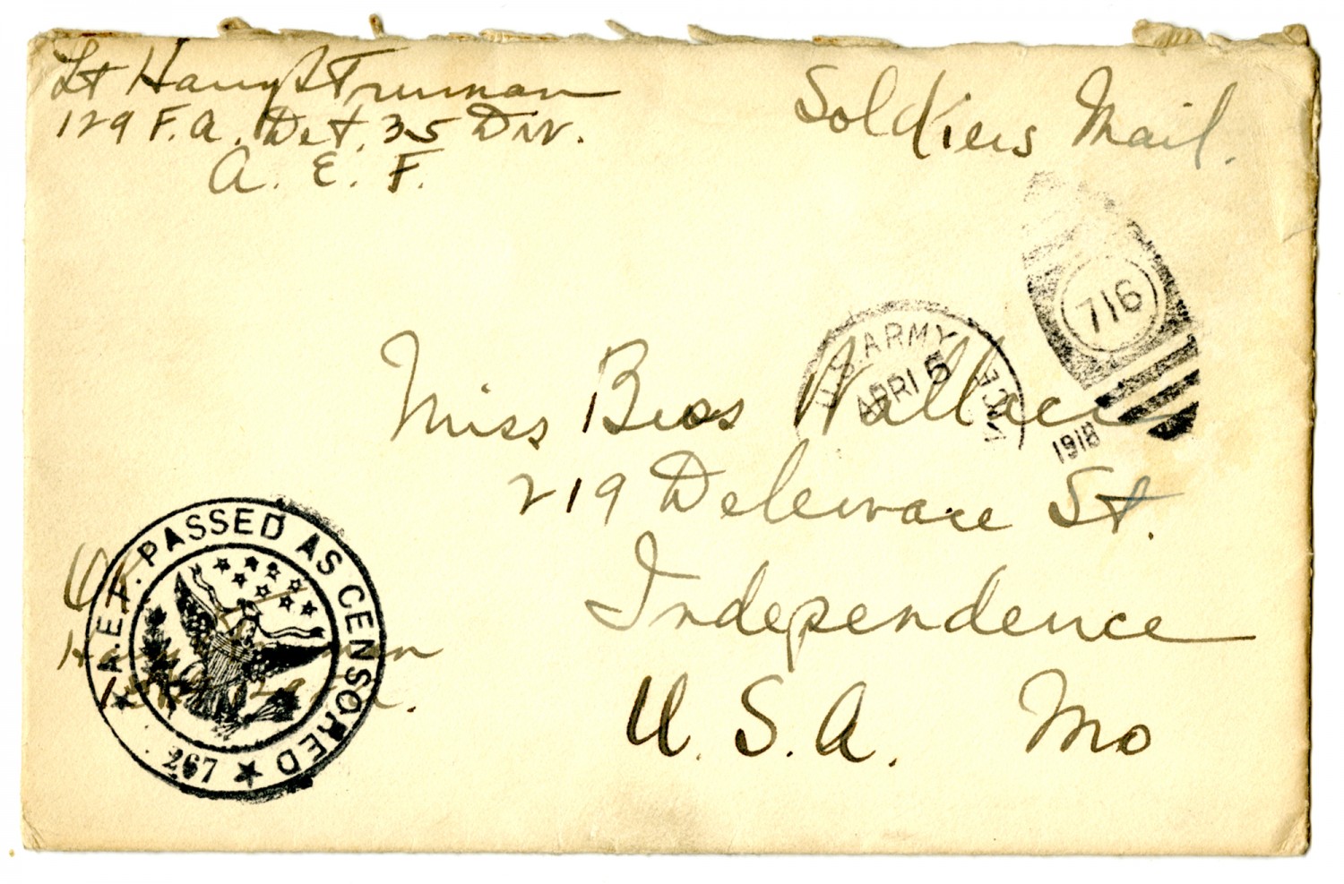 LT Harry S. Truman 129 F.A. Det. 35 Div. A.E.F. Soldiers Mail. Miss Bess Wallace 219 Delaware St. Independence U.S.A. [Missouri] [stamp] U.S. ARMY APRI 5 1918 [stamp] 716 [stamp] A.E.F PASSED AS CENSORED 267