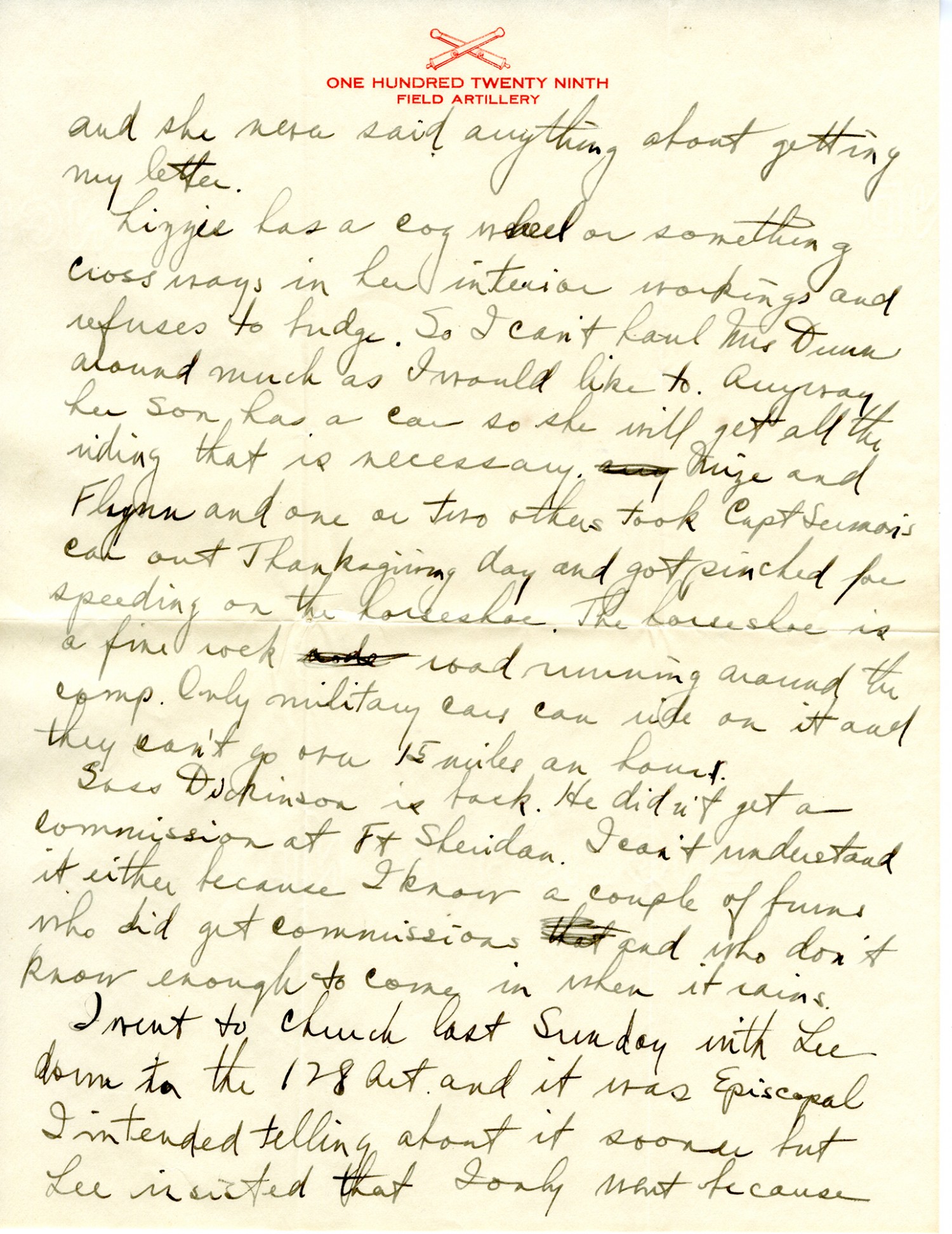 and she never said anything about getting my letter. Lizzie has a cog wheel or something cross ways in her interior workings and refuses to budge. So I can't haul Mrs. Dunn around much as I would like to. Anyway her son has a car so she will get all the riding that is necessary. Mize and Flynn and one or two others took Capt Sermon's car out Thanksgiving day and pinched for speeding on the horseshoe. The horseshoe is a fine rock road running around the camp. Only military cars can ride on it and they can't go over 15 miles an hour. Sass Dickinson is back. He didn't get a commission at Ft Sheridan. I can't understand it either because I know a couple of bums who did get commissions and who don't know enough to come in when it rains. I went to church last Sunday with Lee down to the 128th Art. and it was Episcopal I intended telling about it sooner but Lee insisted that I only went because