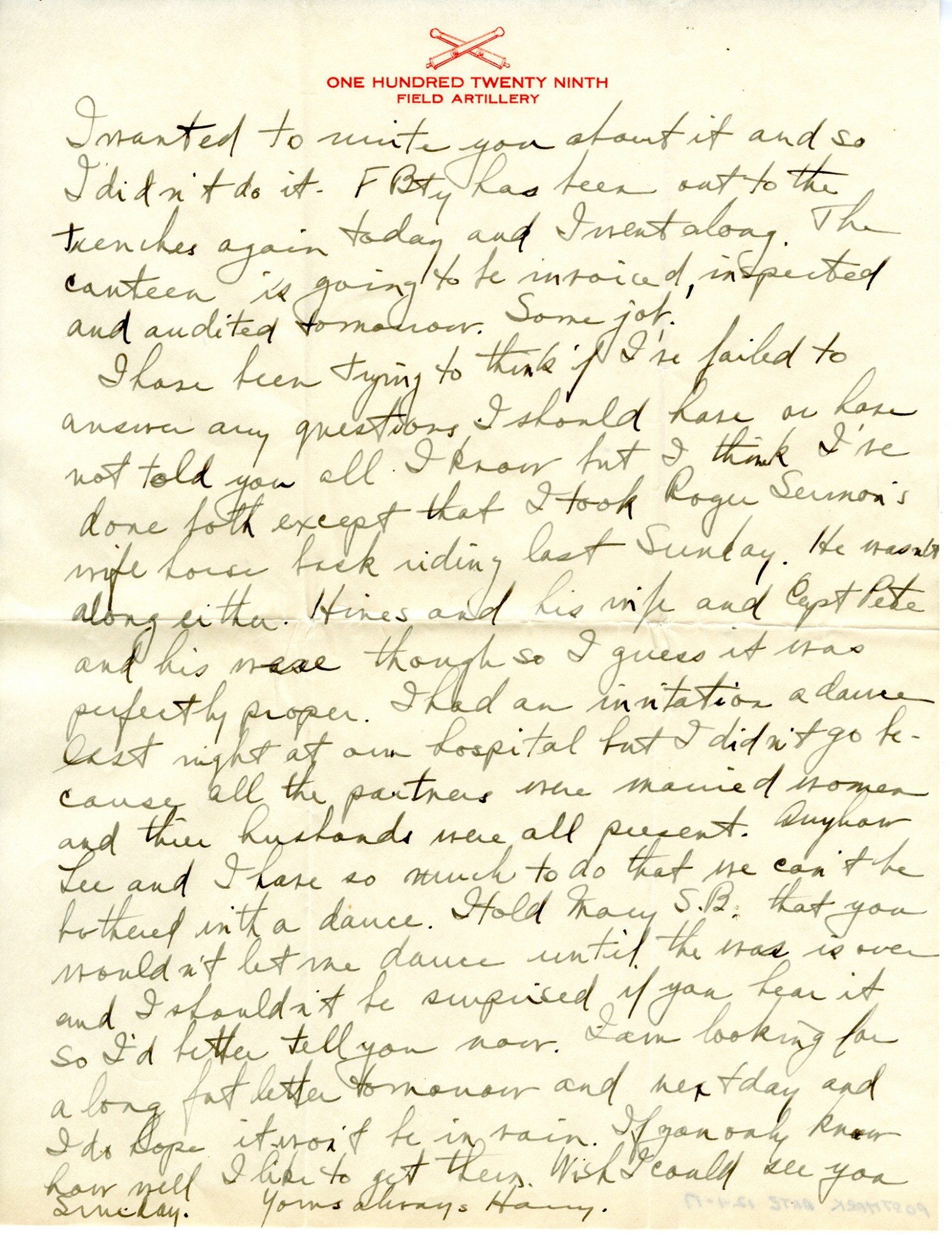 I wanted to write you about it and so I didn't do it. F Bty has been out to the trenches again today and I went along. The canteen is going to be invoiced, inspected and audited tomorrow. Some job. I have been trying to think if I've failed to answer any questions I should have or have not told you all I know but I think I've done both except that I took Roger Sermon's wife horseback riding last Sunday. He wasn't along either. Hines and his wife and Capt Pete and his were though so I guess it was perfectly proper. I had an invitation a dance last night at our hospital but I didn't go because all the partners were married women and their husbands were all present. Anyhow Lee and I have so much to do that we can't be bothered with a dance. I told Mary S. B. that you wouldn't let me dance until the war is over and I shouldn't be surprised if you hear it so I'd better tell you now. I am looking for a long fat letter tomorrow and next day and I do hope it won't be in vain. If you only know how well I like to get them. Wish I could see you Sunday. Yours always Harry