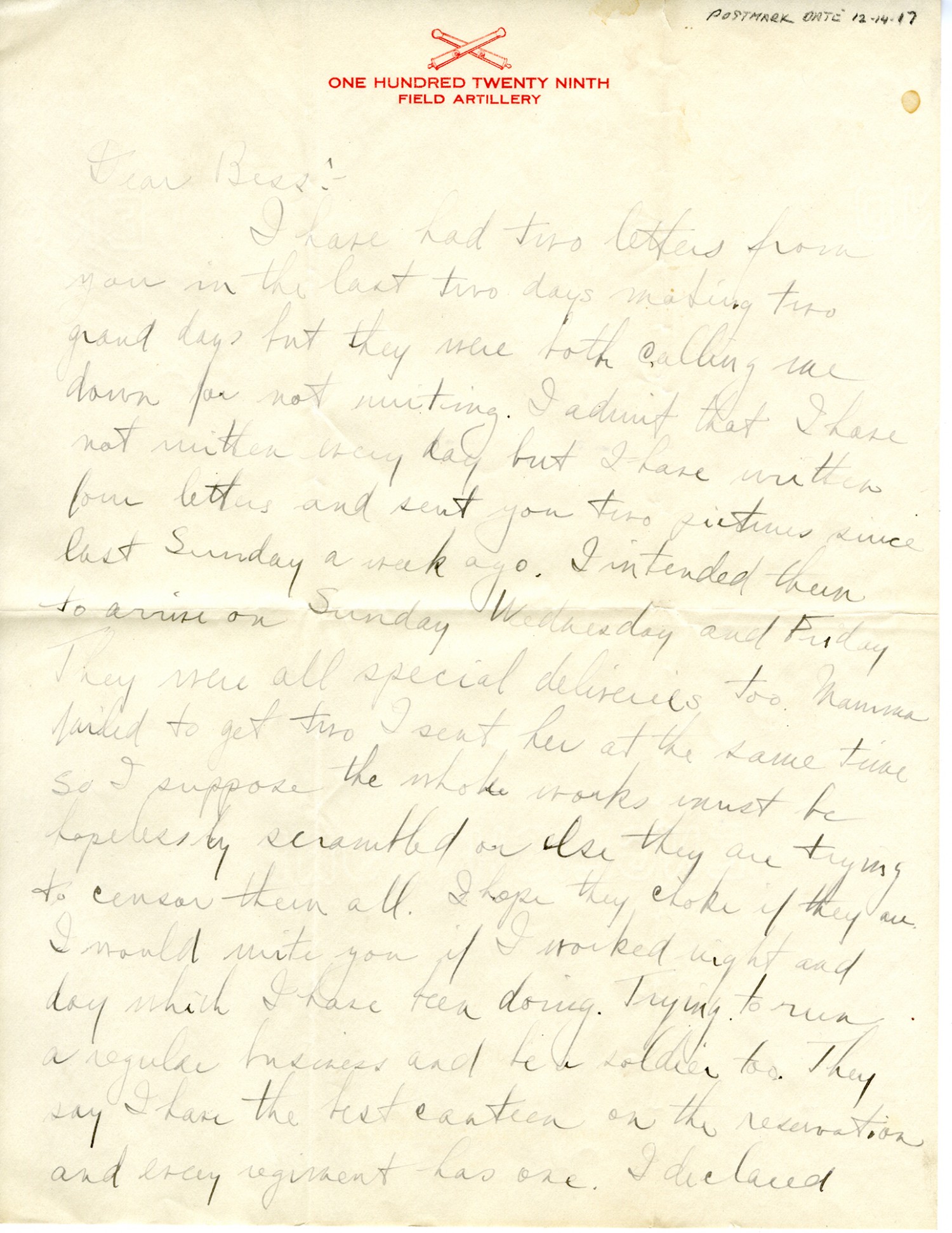 [December 14, 1917] Dear Bess: I have had two letters from you in the last two days making two grand days but they were both calling me down for not writing. I admit that I have not written every day but I have written four letters and sent you two pictures since last Sunday a week ago. I intended them to arrive on Sunday Wednesday and Friday. They were all special deliveries too. Mamma failed to get two I sent her at the same time so I suppose the whole works must be hopelessly scrambled or else they are trying to censor them all. I hope they choke if they are. I would write you if I worked night and day which I have been doing. Trying to run a regular business and be a soldier too. They say I have the best canteen on the reservation and every regiment has one. I declared