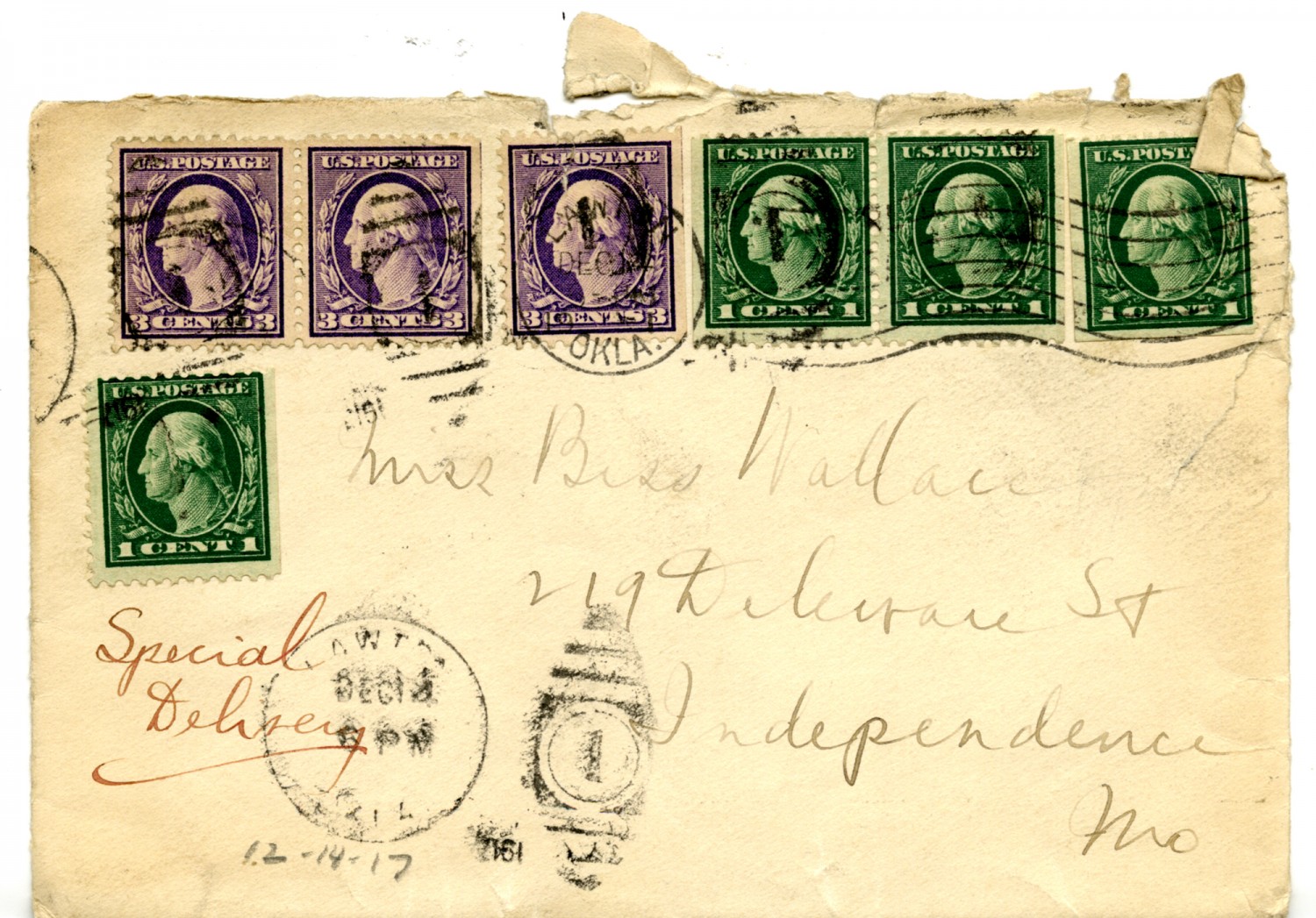 Special Delivery [ms illegible: stamp] 12-14-[1917] Miss Bess Wallace 219 Delaware St Independence [Missouri]