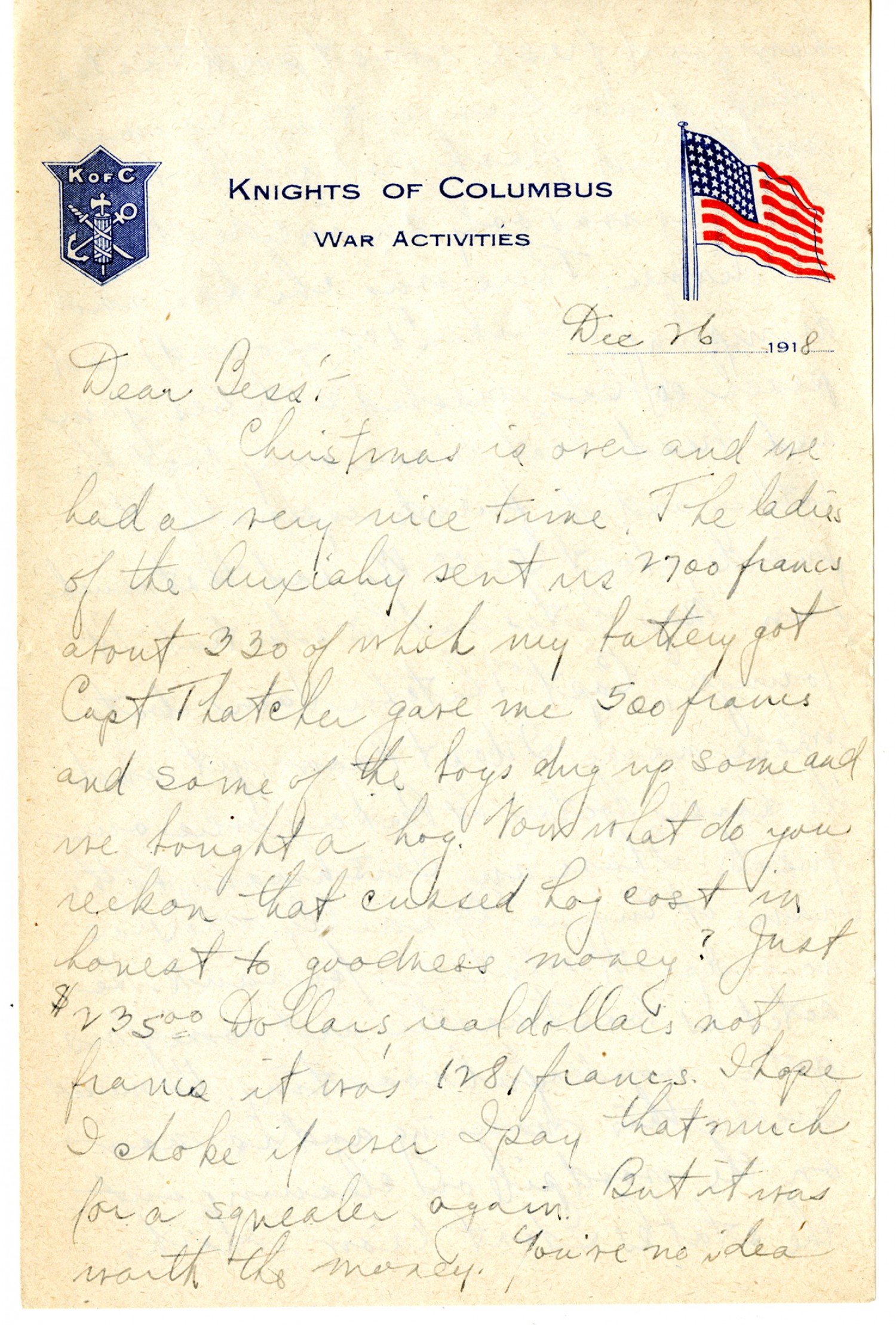 [Knights of Columbus letterhead]December 26, 1918 Dear Bess: Christmas is over and we had a very nice time. The ladies of the Auxialry sent us 2700 francs about 330 of which my battery got. Capt. Thatcher gave me 500 francs and some of the boys dug up some and we bought a hog. Now what do you reckon that cussed hog cost in honest to goodness money? Just $235.00 dollars, real dollars not francs it was 1291 francs. I hope I choke if ever I pay that much for a squealer again. But it was worth the money. You've no idea