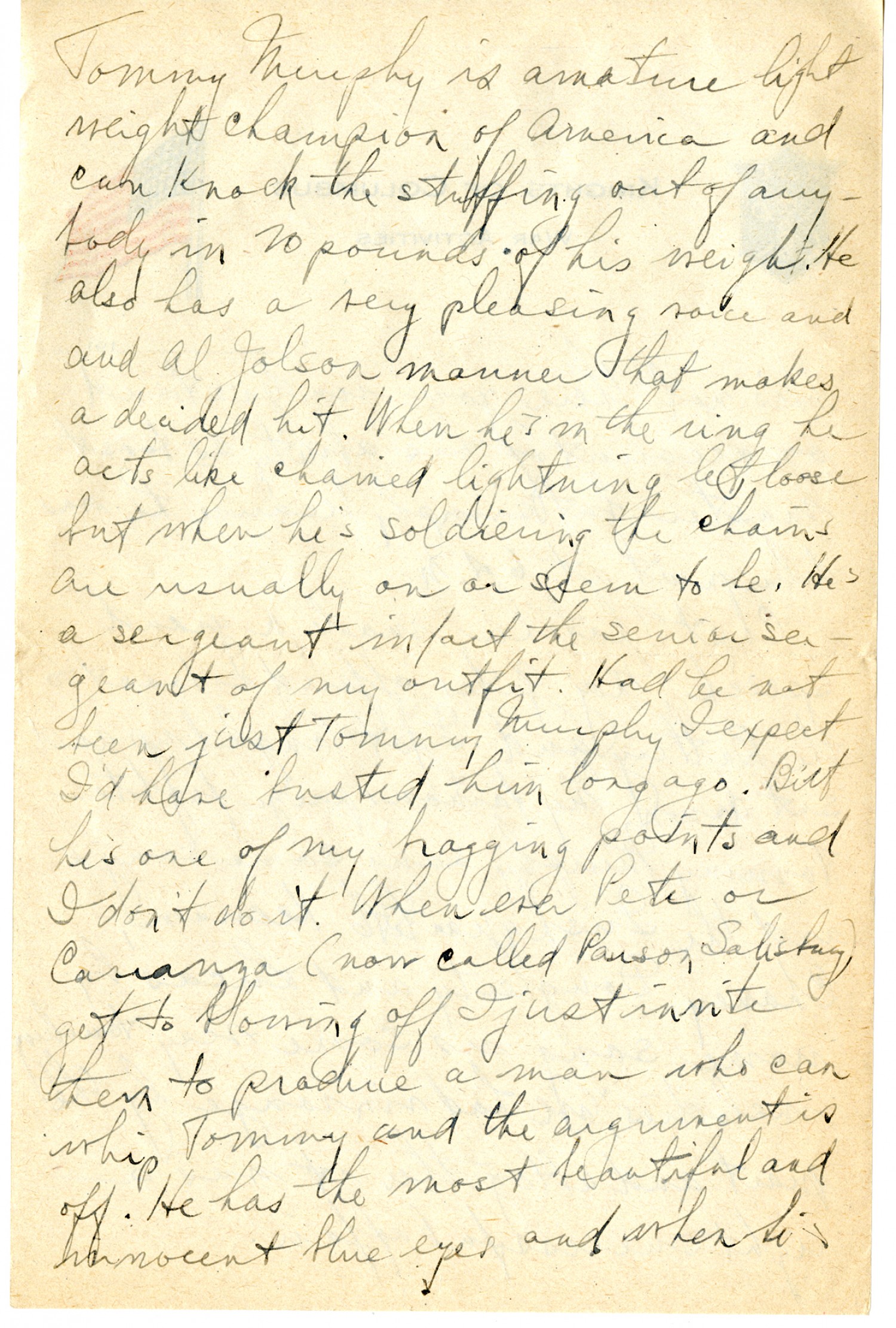 Tommy Murphy is amature lightweight champion of America and can knock the stuffing out of anybody in 20 pounds of his weight. He also has a very pleasing voice and an Al Jolson manner that makes a decided hit. When he's in the ring he acts like chained lightning let loose but when he's soldiering the chains are usually on or seem to be. He's a sergeant in fact the senior sergeant of my outfit. Had he not been just Tommy Murphy I expect I'd have busted him long ago. But he's one of my bragging points and I don't do it. Whenever Pete or Caranza (now called Parson Salisbury) get to blowing off I just invite them to produce a man who can whip Tommy and the argument is off. He has the most beautiful and innocent blue eyes and when he's