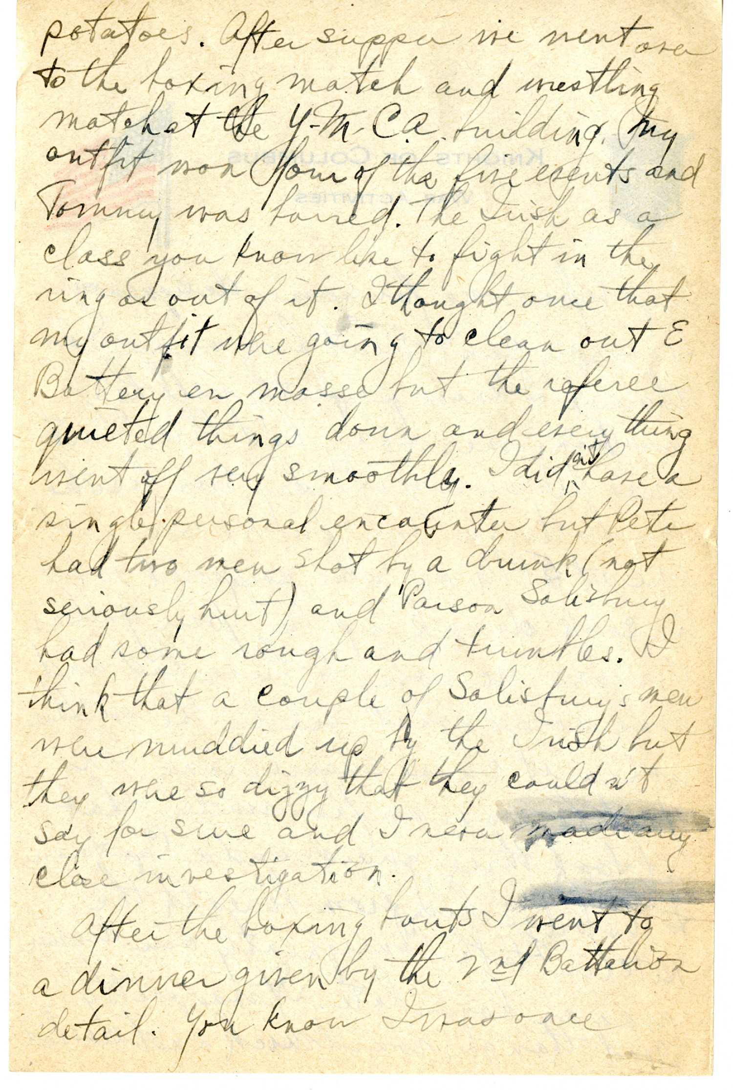 potatoes. After supper we went over to the boxing match and wrestling match at the Y.M.C.A. building. My outfit won four of the five events and Tommy was barred. The Irish as a class you know like to fight in the ring or out of it. I thought once that my outfit were going to clean out E Battery en masse but the referee quieted things down and everything went off very smoothly. I didn't have a single personal encounter but Pete had two men shot by a drunk (not seriously hurt) and Parson Salisbury had some rough and tumbles. I think that a couple of Salisbury's men were muddied up by the Irish but they were so dizzy that they couldn't say for sure and I never made any close investigation. After the boxing bouts I went to a dinner given by the 2nd Battalion detail. You know I was once
