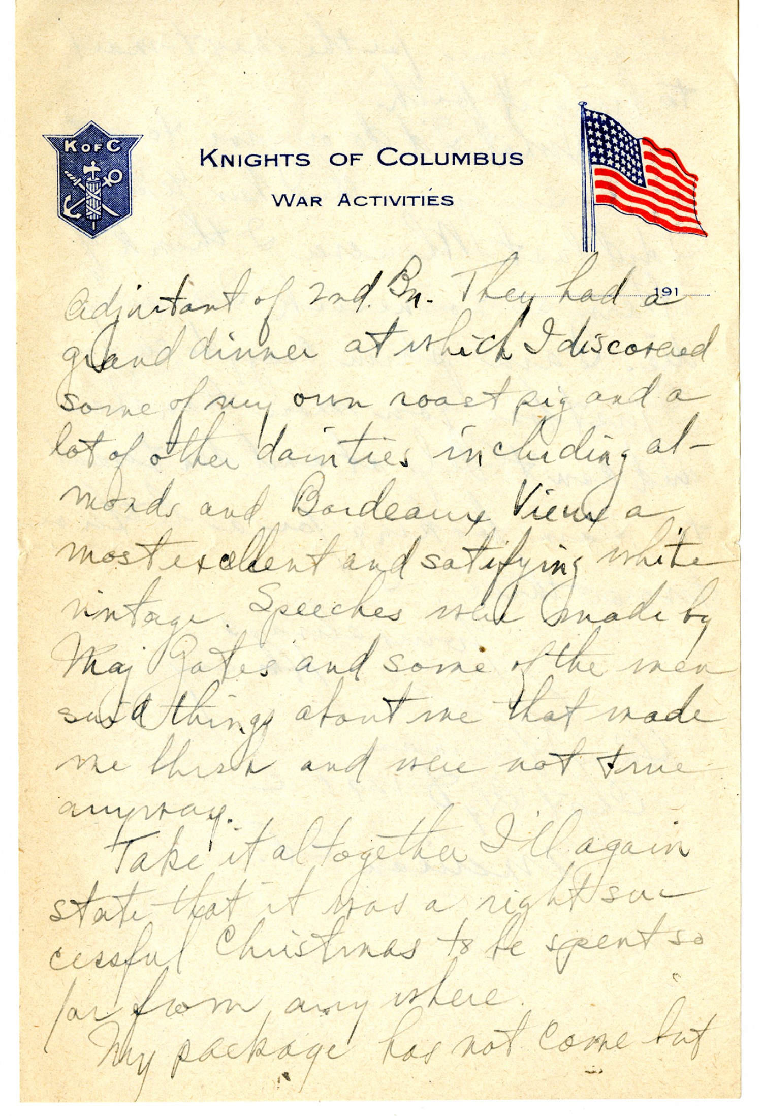[Knights of Columbus letterhead] adjutant of 2nd Bn. They had a grand dinner at which I discovered some of my own roast pig and a lot of other dainties including almonds and Bordeaux Vieux a most excellent and satisfying white vintage. Speeches were made by Maj. Gates and some of the men said things about me that made me blush and were not true anyway. Take it altogether I'll again state that it was a right successful Christmas to be spent so far from anywhere. My package has not come but