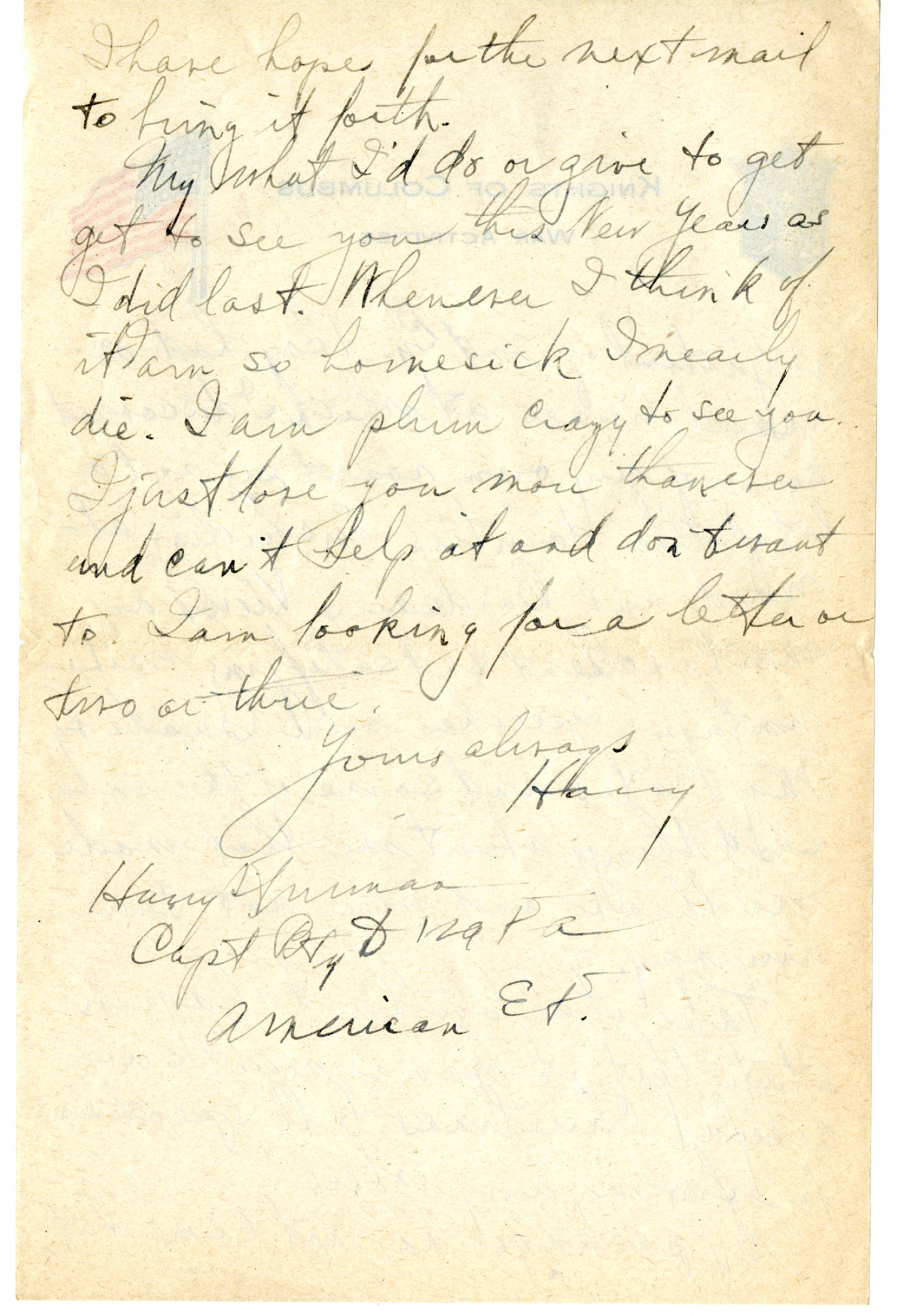 I hope for the next mail to bring it forth. My what I'd do or give to get to get to see you this New Years as I did last. Whenever I think of it I am so homesick I nearly die. I am plum crazy to see you. I just love you more than ever and can't help it and don't want to. I am looking for a letter or two or thrice. Yours always Harry. Harry Truman Capt Bty D 129 F A American E F